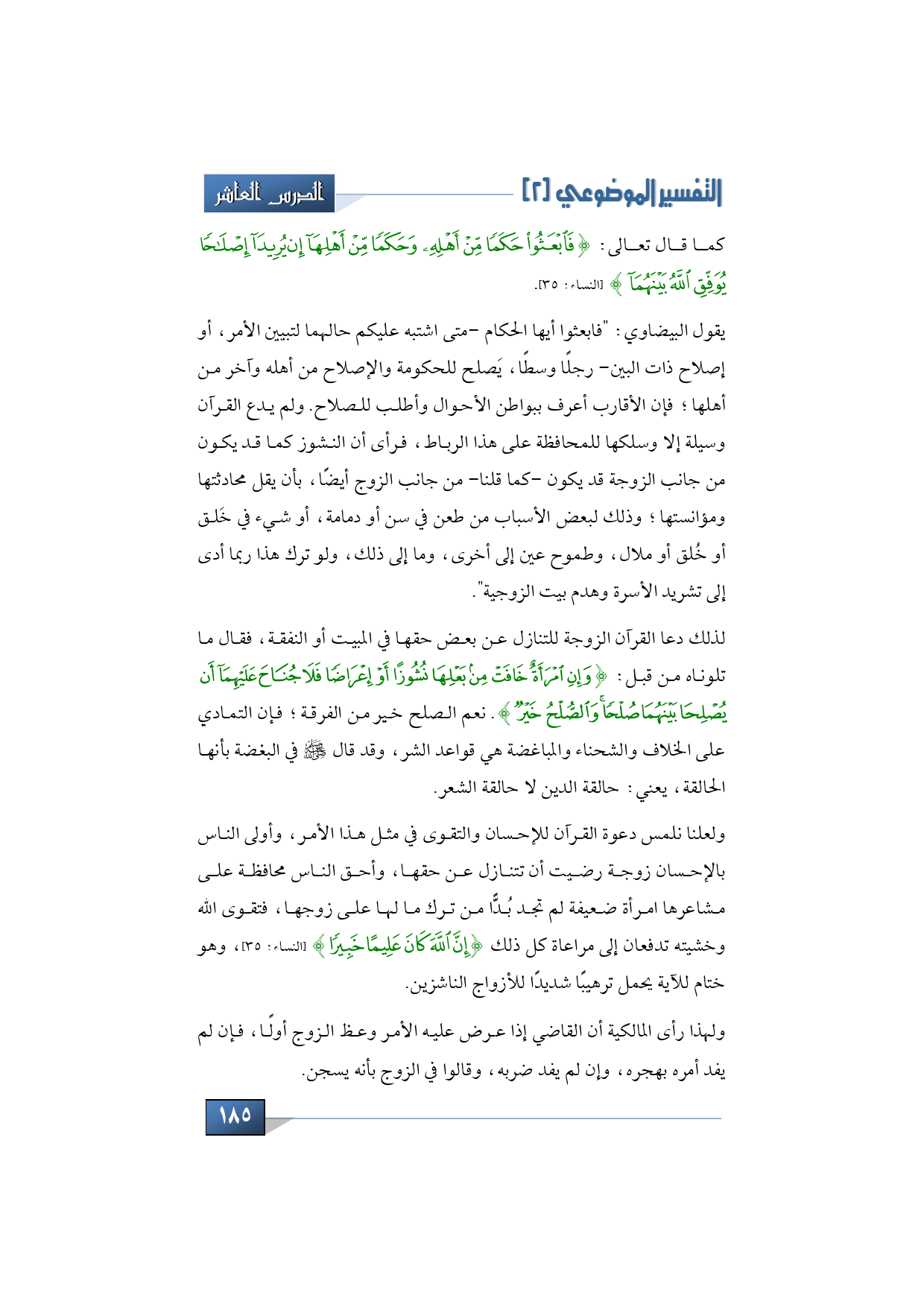 يقول البيضاوي: "فابعثوا أيها الحكام متى اشتبه عليكم حالهما لتبيين الأمر، أو إصلاح ذات البين رجلًا وسطًا، يَصلح للحكومة والإصلاح من أهله وآخر من أهلها، فإن الأقارب أعرف ببواطن الأحوال وأطلب للصلاح، ولم يدع القرآن وسيلة إلا وسلكها للمحافظة على هذا الرباط، فرأى أن النشوز كما قد يكون من جانب الزوجة قد يكون -كما قلنا- من جانب الزوج أيضًا بأن يقل محادثتها ومؤانستها؛ وذلك لبعض الأسباب من طعن في سن أو دمامة، أو شيء في خَلق أو خُلق أو ملال، وطموح عين إلى أخرى، وما إلى ذلك، ولو ترك هذا ربما أدى إلى تشريد الأسرة وهدم بيت الزوجية".