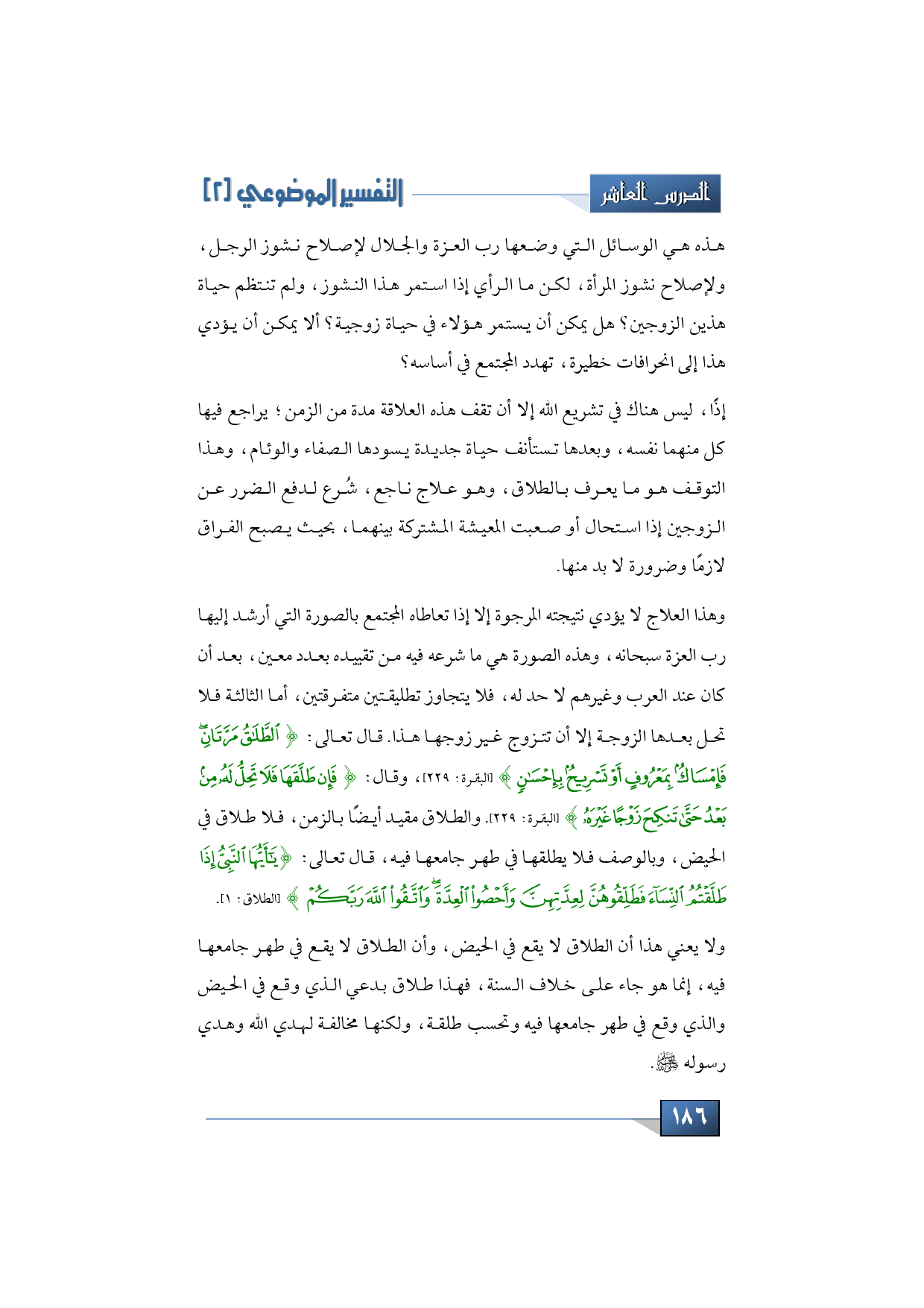 وهذه الصورة هي ما شرعه فيه من تقييده بعدد معين، بعد أن كان عند العرب وغيرهم لا حد له، فلا يتجاوز تطليقتين متفرقتين، أما الثالثة فلا تحل بعدها الزوجة إلا أن تتزوج غير زوجها هذا. قال تعالى: {الطَّلاقُ مَرَّتَانِ فَإمْسَاكٌ بِمَعْرُوفٍ أَوْ تَسْرِيحٌ بِإِحْسَانٍ} (البقرة: 229). وقال: {فَإِنْ طَلَّقَهَا فَلا تَحِلُّ لَهُ مِنْ بَعْدُ حَتَّى تَنكِحَ زَوْجًا غَيْرَه} (البقرة: 229). والطلاق مقيد أيضًا بالزمن، فلا طلاق في الحيض، وبالوصف فلا يطلقها في طهر جامعها فيه. قال تعالى: {يا أيها النَّبِيُّ إِذَا طَلَّقْتُمْ النِّسَاءَ فَطَلِّقُوهُنَّ لِعِدَّتِهِنَّ وَأَحْصُوا الْعِدَّةَ وَاتَّقُوا اللَّهَ رَبَّكُمْ} (الطلاق: 1).