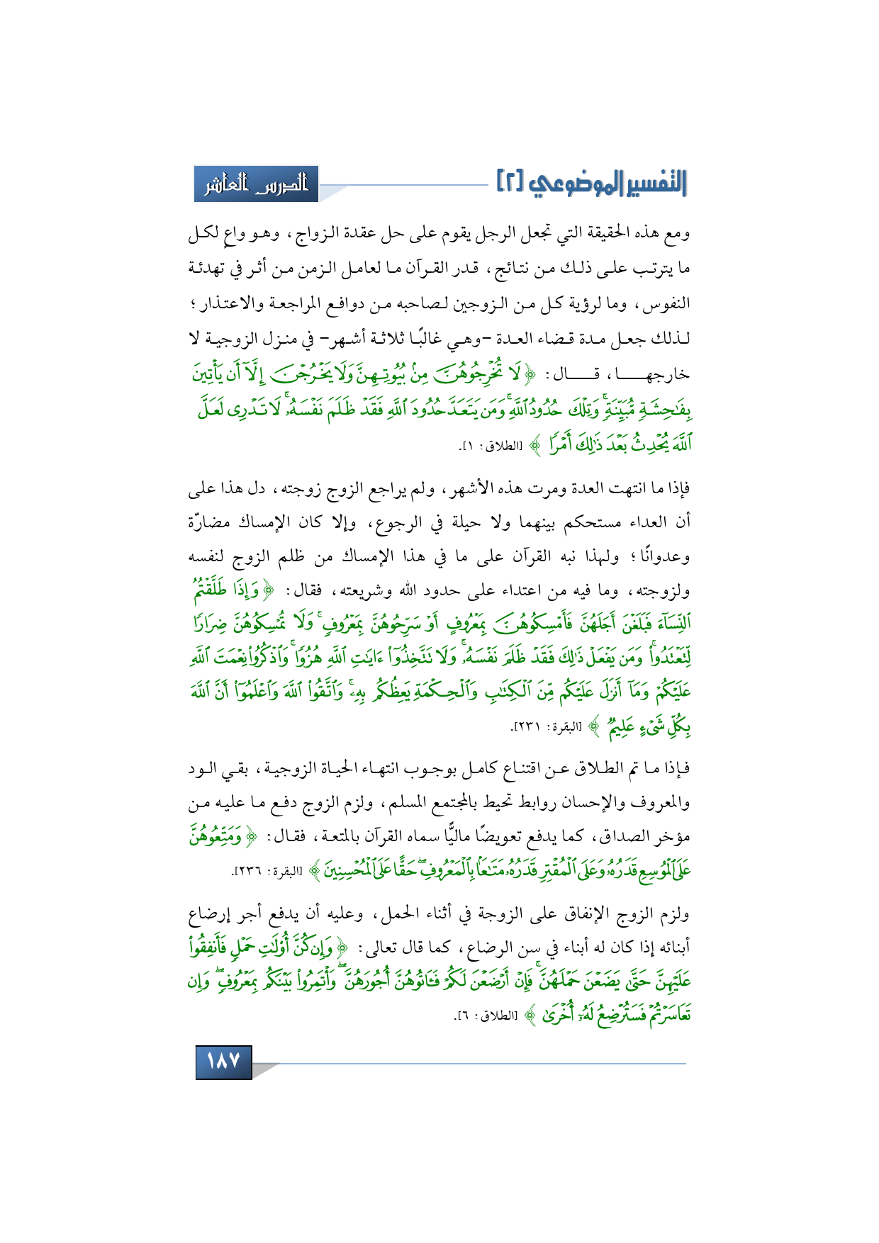فإذا ما انتهت العدة ومرت هذه الأشهر، ولم يراجع الزوج زوجته، دل هذا على العداء مستحكم بينهما، ولا حيلة في الرجوع، وإلا كان الإمساك مضارة وعدوانًا، ولهذا نبه القرآن على ما في هذا الإمساك من ظلم الزوج لنفسه ولزوجته، وما فيه من اعتداء على حدود الله وشريعته، فقال: {وَإِذَا طَلَّقْتُمُ النِّسَاءَ فَبَلَغْنَ أَجَلَهُنَّ فَأَمْسِكُوهُنَّ بِمَعْرُوفٍ أَوْ سَرِّحُوهُنَّ بِمَعْرُوفٍ وَلَا تُمْسِكُوهُنَّ ضِرَارًا لِتَعْتَدُوا وَمَنْ يَفْعَلْ ذَلِكَ فَقَدْ ظَلَمَ نَفْسَهُ وَلَا تَتَّخِذُوا آيَاتِ اللَّهِ هُزُوًا وَاذْكُرُوا نِعْمَةَ اللَّهِ عَلَيْكُمْ وَمَا أَنْزَلَ عَلَيْكُمْ مِنَ الْكِتَابِ وَالْحِكْمَةِ يَعِظُكُمْ بِهِ وَاتَّقُوا اللَّهَ وَاعْلَمُوا أَنَّ اللَّهَ بِكُلِّ شَيْءٍ عَلِيمٌ} (البقرة: 231).