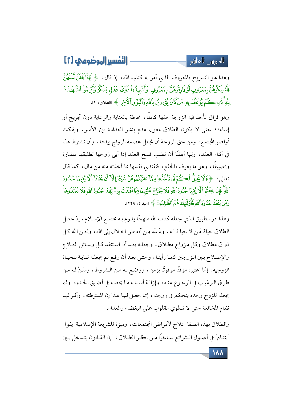 وهذا هو التسريح بالمعروف الذي أمر به كتاب الله إذ قال: {فَإِذَا بَلَغْنَ أَجَلَهُنَّ فَأَمْسِكُوهُنَّ بِمَعْرُوفٍ أَوْ فَارِقُوهُنَّ بِمَعْرُوفٍ وَأَشْهِدُوا ذَوَيْ عَدْلٍ مِنْكُمْ وَأَقِيمُوا الشَّهَادَةَ لِلَّهِ ذَلِكُمْ يُوعَظُ بِهِ مَنْ كَانَ يُؤْمِنُ بِاللَّهِ وَالْيَوْمِ الْآخِرِ} (الطلاق: 2).
