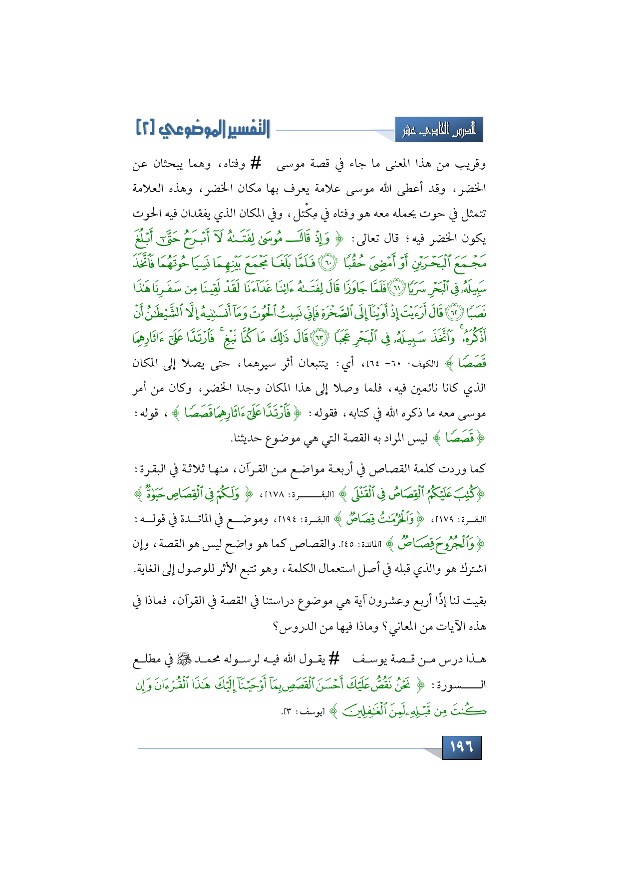 أي: يتتبعان أثر سيرهما، حتى يصلا إلى المكان الذي كانا نائمين فيه، فلما وصلا إلى هذا المكان وجدا الخضر، وكان من أمر موسى معه ما ذكره الله في كتابه، فقوله: {فَارْتَدَّا عَلَى آثَارِهِمَا قَصَصًا} قوله: {قَصَصًا} ليس المراد به القصة التي هي موضوع حديثنا، كما وردت كلمة القصاص في أربعة مواضع من القرآن، منها ثلاثة في البقرة: {كُتِبَ عَلَيْكُمُ الْقِصَاصُ فِي الْقَتْلَى} (البقرة: 178)، {وَلَكُمْ فِي الْقِصَاصِ حَيَاةٌ} (البقرة: 179)، {وَالْحُرُمَاتُ قِصَاص} (البقرة: 194) وموضع في المائدة في قوله: {وَالْجُرُوحَ قِصَاصٌ} (المائدة: 45).
