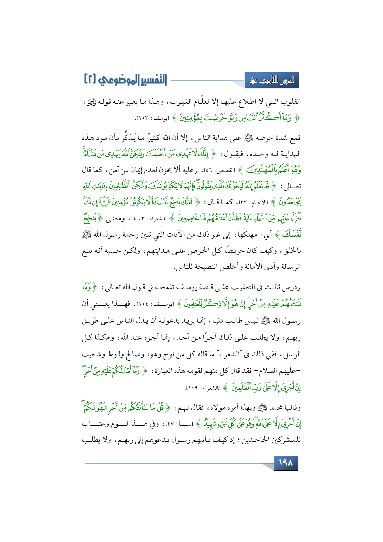 ودرس ثالث في التعقيب على قصة يوسف تلمحه في قول الله تعالى: {وَمَا تَسْأَلُهُمْ عَلَيْهِ مِنْ أَجْرٍ إِنْ هُوَ إِلَّا ذِكْرٌ لِلْعَالَمِينَ} (يوسف: 104) فهذا يعني أن رسول الله -صلى الله عليه وسلم- ليس طالب دنيا، إنما يريد بدعوته أن يدل الناس على طريق ربهم، لا يطلب على ذلك أجرًا من أحد، إنما أجره عند الله، وهكذا كل الرسل، واقرءوا في ذلك في "الشعراء" ما قاله كل من نوح وهود وصالح ولوط وشعيب -عليهم السلام- فقد قال كل منهم لقومه هذه العبارة: {وَمَا أَسْأَلُكُمْ عَلَيْهِ مِنْ أَجْرٍ إِنْ أَجْرِيَ إِلَّا عَلَى رَبِّ الْعَالَمِينَ} (الشعراء: 109).