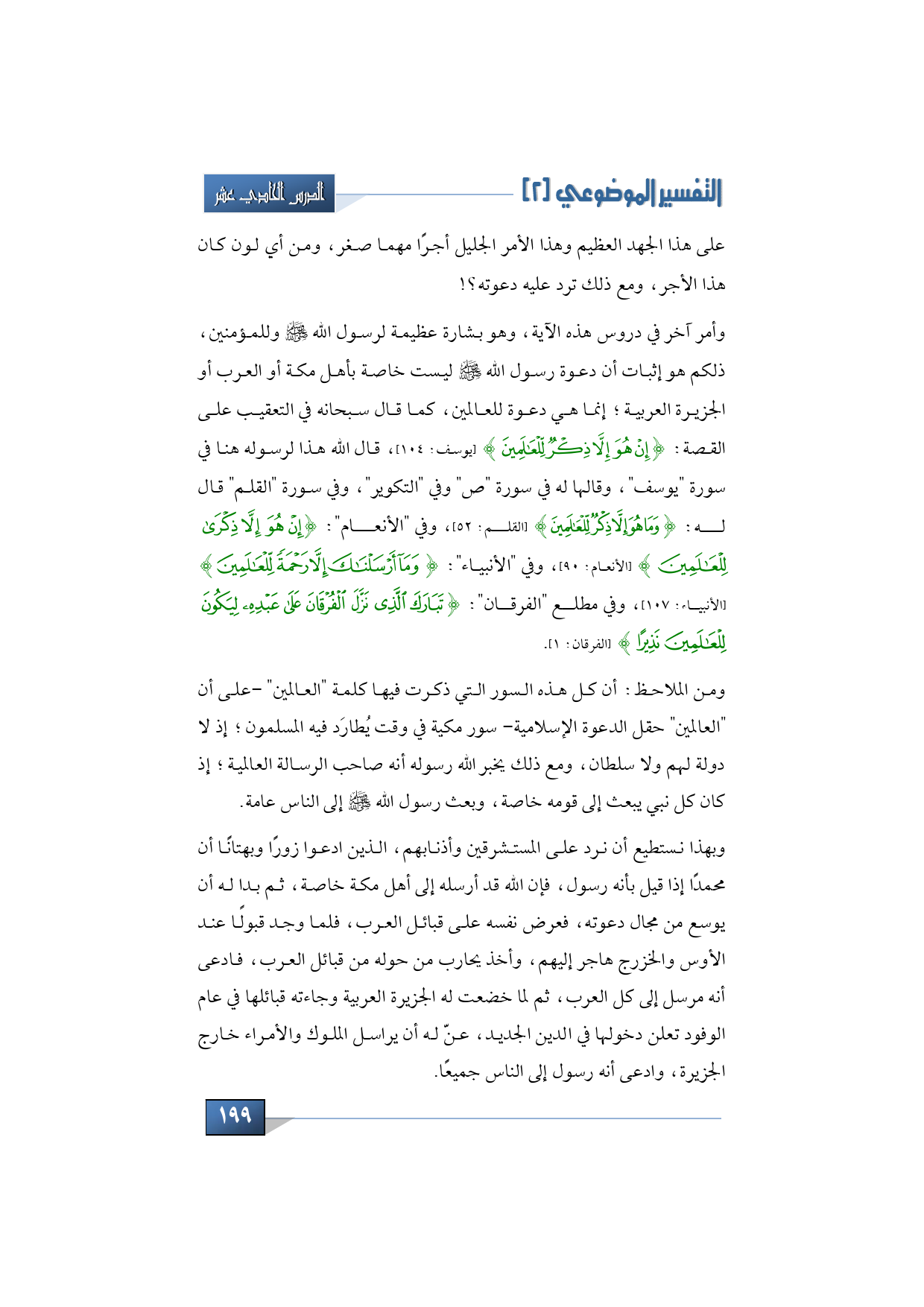 ولعلكم لاحظتم معي أن كل هذه السور التي ذكرت فيها كلمة "العالمين"، على أن "العالمين" حقل الدعوة الإسلامية، كل هذه سور مكية في وقت يطارد فيه المسلمون، إذ لا دولة لهم ولا سلطان، ومع ذلك يخبر الله رسوله أنه صاحب الرسالة العالمية، إذ كان كل نبي يبعث إلى قومه خاصة، وبعث رسول الله -صلى الله عليه وسلم- إلى الناس عامة.