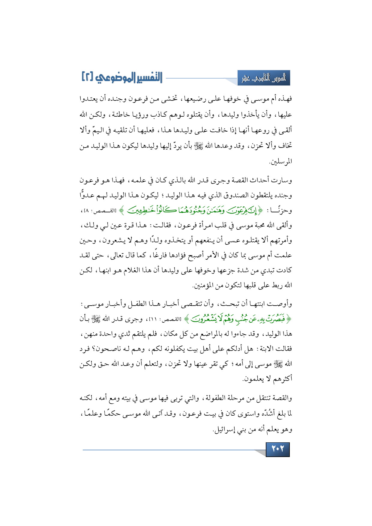 وأوصت ابنتها أن تبحث وأن تتقصى أخبار هذا الطفل وأخبار موسى: {فَبَصُرَتْ بِهِ عَنْ جُنُبٍ وَهُمْ لَا يَشْعُرُونَ} (القصص: 11) وجرى قدر الله -سبحانه وتعالى- بأن هذا الوليد، وقد جاءوا له بالمراضع من كل مكان، فلم يلتقم ثدي واحدة منهن فقالت البنية: هل أدلكم على أهل بيت يكفلونه لكم وهم له ناصحون، فرد الله -سبحانه وتعالى- موسى إلى أمه كي تقر عينها ولا تحزن، ولتعلم أن وعد الله حق ولكن أكثرهم لا يعلمون.