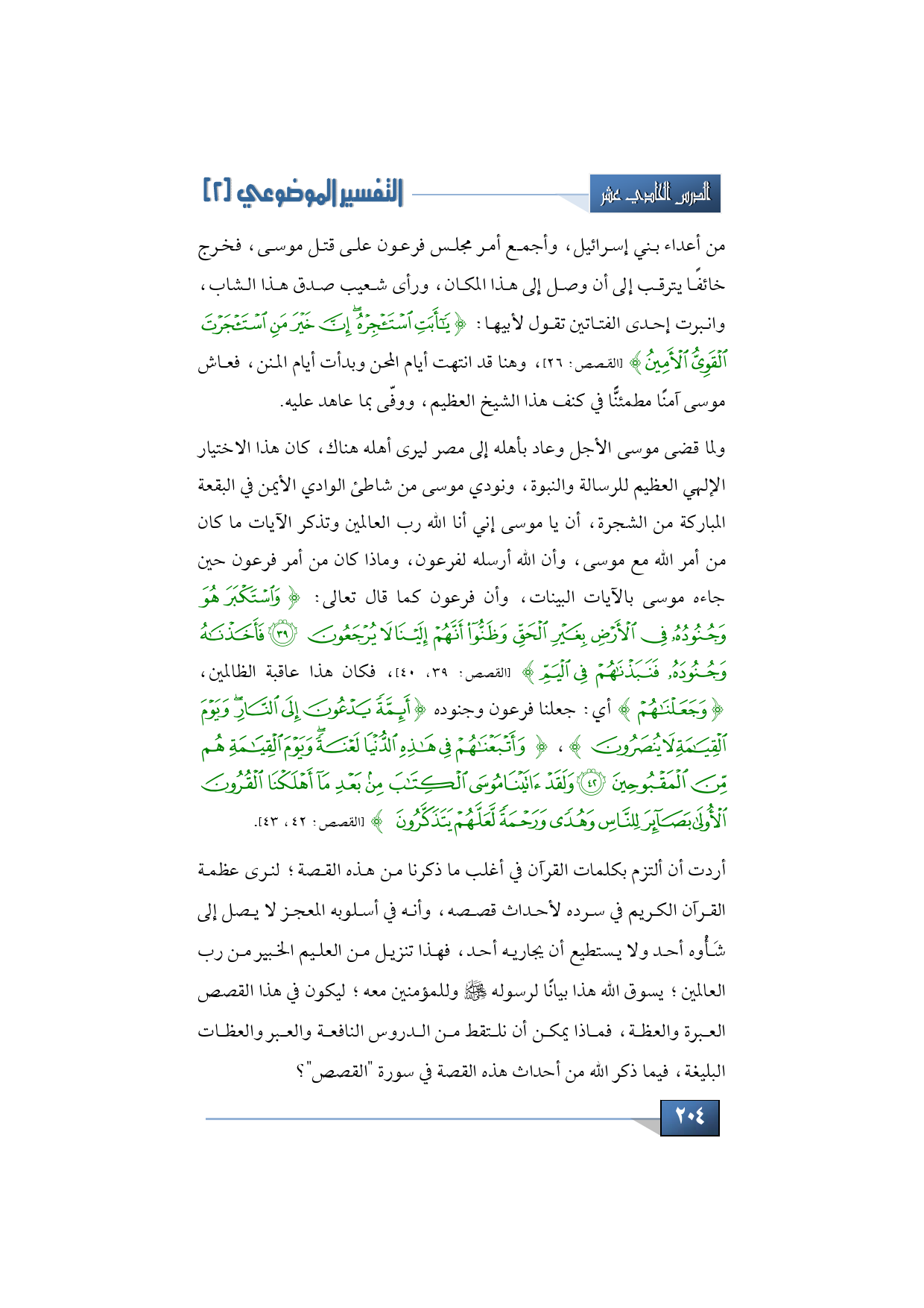 ولما قضى موسى الأجل وعاد بأهله إلى مصر ليرى أهله هناك، كان هذا الاختيار الإلهي العظيم للرسالة والنبوة، ونودي موسى من شاطئ الوادي الأيمن في البقعة المباركة من الشجرة، أن يا موسى إني أنا الله رب العالمين، وتذكر الآيات ما كان من أمر الله مع موسى، وأن الله أرسله لفرعون، وماذا كان من أمر فرعون حين جاءه موسى بالآيات البينات، وأن فرعون كما قال تعالى: {وَاسْتَكْبَرَ هُوَ وَجُنُودُهُ فِي الْأَرْضِ بِغَيْرِ الْحَقِّ وَظَنُّوا أَنَّهُمْ إِلَيْنَا لَا يُرْجَعُونَ * فَأَخَذْنَاهُ وَجُنُودَهُ فَنَبَذْنَاهُمْ فِي الْيَمِّ} (القصص: 39، 40) فانظر أيها المشاهد ويا من له النظر كيف كان عاقبة الظالمين، وجعلناهم أي: جعلنا فرعون وجنوده أئمة يدعون إلى النار ويوم القيامة لا ينصرون {وَأَتْبَعْنَاهُمْ فِي هَذِهِ الدُّنْيَا لَعْنَةً وَيَوْمَ الْقِيَامَةِ هُمْ مِنَ الْمَقْبُوحِينَ * وَلَقَدْ آتَيْنَا مُوسَى الْكِتَابَ مِنْ بَعْدِ مَا أَهْلَكْنَا الْقُرُونَ الْأُولَى بَصَائِرَ لِلنَّاسِ وَهُدًى وَرَحْمَةً لَعَلَّهُمْ يَتَذَكَّرُونَ} (القصص: 42، 43).