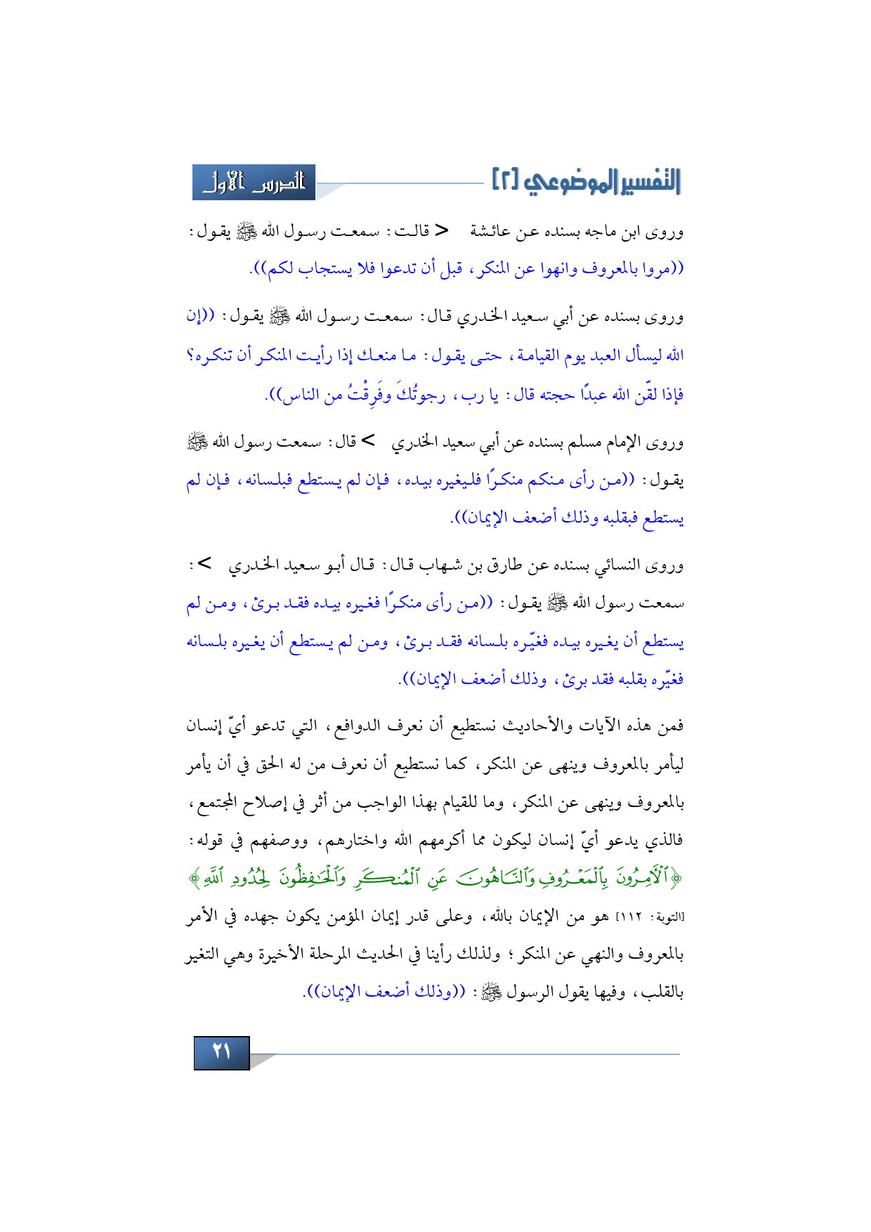 وروى ابن ماجه بسنده عن عائشة -رضي الله عنها- قالت: سمعت رسول الله -صلى الله عليه وسلم- يقول: ((مروا بالمعروف وانهوا عن المنكر، قبل أن تدعوا فلا يستجاب لكم)) وروى بسنده عن أبي سعيد الخدري قال: سمعت رسول الله -صلى الله عليه وسلم- يقول: ((إن الله ليسأل العبد يوم القيامة حتى يقول: ما منعك إذا رأيت المنكر أن تنكره؟ فإذا لقّن الله عبدًا حجته قال: يا رب رجوتك وفرقت من الناس)) وروى الإمام مسلم بسنده عن أبي سعيد الخدري -رضي الله عنه- قال: سمعت رسول الله -صلى الله عليه وسلم- يقول: ((من رأى منكم منكرًا فليغيره بيده، فإن لم يستطع فبلسانه، فإن لم يستطع فبقلبه وذلك أضعف الإيمان)). وروى النسائي بسنده عن طارق بن شهاب قال: قال أبو سعيد الخدري -رضي الله عنه-: سمعت رسول الله -صلى الله عليه وسلم- يقول: ((من رأى منكرًا فغيره بيده فقد برئ، ومن لم يستطع أن يغيره بيده فغيّره بلسانه فقد برئ، ومن لم يستطع أن يغيره بلسانه فغيّره بقلبه فقد برئ، وذلك أضعف الإيمان)).