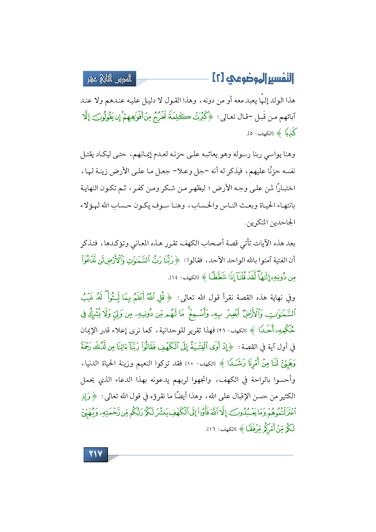 وهنا يواسي ربنا رسوله وهو يعاتبه على حزنه لعدم إيمانهم، حتى ليكاد يقتل نفسه حزنًا عليهم، فيذكر له أنه -جل وعلا- جعل ما على الأرض زينة لها، اختبارًا لمن على وجه الأرض؛ ليظهر من شكر ومن كفر، ثم تكون النهاية بانتهاء الحياة وبعث الناس والحساب، وهنا سوف يكون حساب الله لهؤلاء الجاحدين المنكرين، بعد هذه الآيات تأتي قصة أصحاب الكهف تقرر هذه المعاني وتؤكدها، فتذكر أن الفتية آمنوا بالله الواحد الأحد فقالوا: {رَبُّنَا رَبُّ السَّمَاوَاتِ وَالْأَرْضِ لَنْ نَدْعُوَ مِنْ دُونِهِ إِلَهًا لَقَدْ قُلْنَا إِذًا شَطَطًا} (الكهف: 14).
