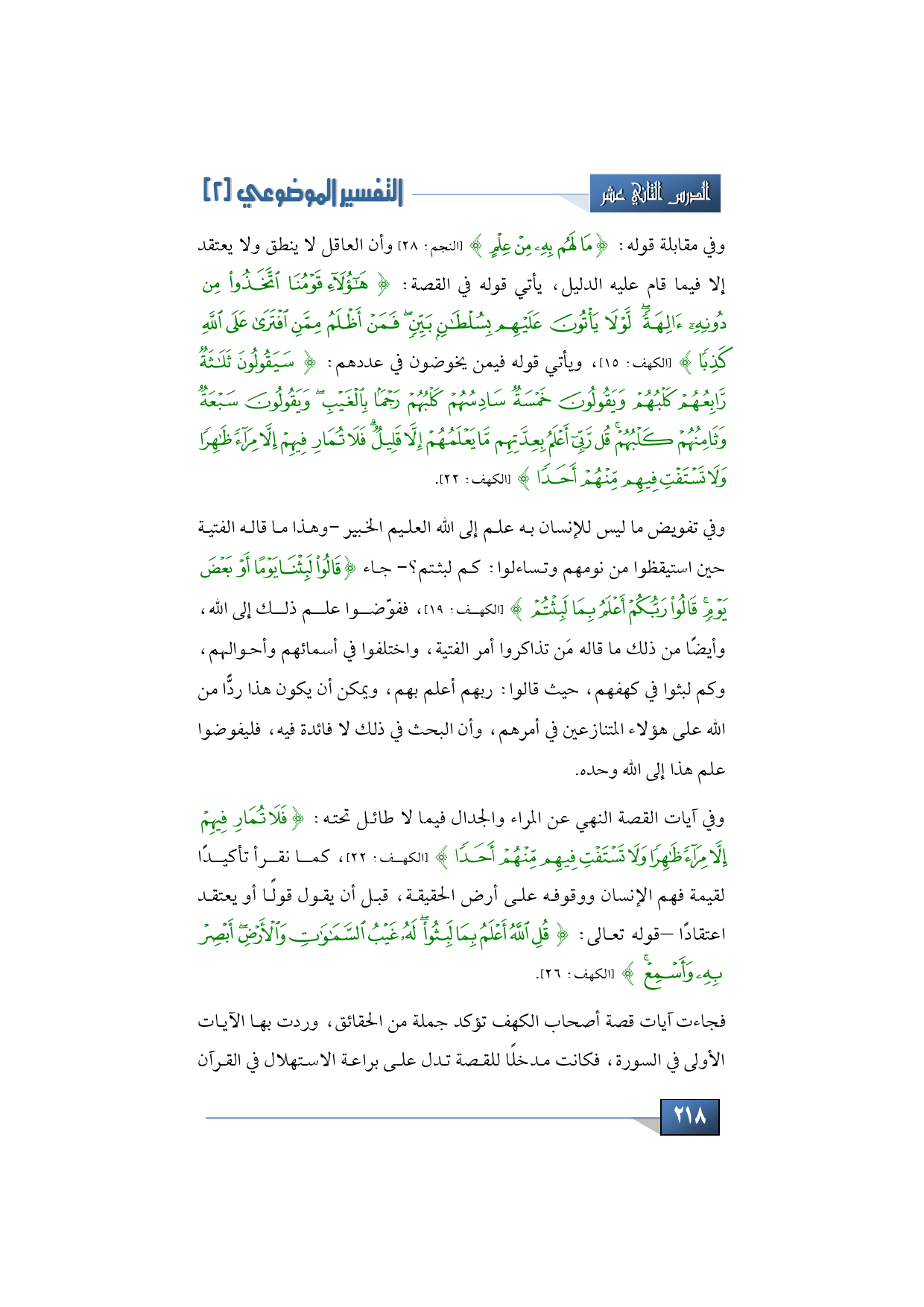 وفي مقابلة قوله: {مَا لَهُمْ بِهِ مِنْ عِلْمٍ} (النجم: 28) وأن العاقل لا ينطق ولا يعتقد إلا فيما قام عليه الدليل يأتي قوله في القصة: {هَؤُلَاءِ قَوْمُنَا اتَّخَذُوا مِنْ دُونِهِ آلِهَةً لَوْلَا يَأْتُونَ عَلَيْهِمْ بِسُلْطَانٍ بَيِّنٍ فَمَنْ أَظْلَمُ مِمَّنِ افْتَرَى عَلَى اللَّهِ كَذِبًا} (الكهف: 15) ويأتي قوله فيمن يخوضون في عددهم: {سَيَقُولُونَ ثَلَاثَةٌ رَابِعُهُمْ كَلْبُهُمْ وَيَقُولُونَ خَمْسَةٌ سَادِسُهُمْ كَلْبُهُمْ رَجْمًا بِالْغَيْبِ وَيَقُولُونَ سَبْعَةٌ وَثَامِنُهُمْ كَلْبُهُمْ قُلْ رَبِّي أَعْلَمُ بِعِدَّتِهِمْ مَا يَعْلَمُهُمْ إِلَّا قَلِيلٌ فَلَا تُمَارِ فِيهِمْ إِلَّا مِرَاءً ظَاهِرًا وَلَا تَسْتَفْتِ فِيهِمْ مِنْهُمْ أَحَدًا} (الكهف: 22).
