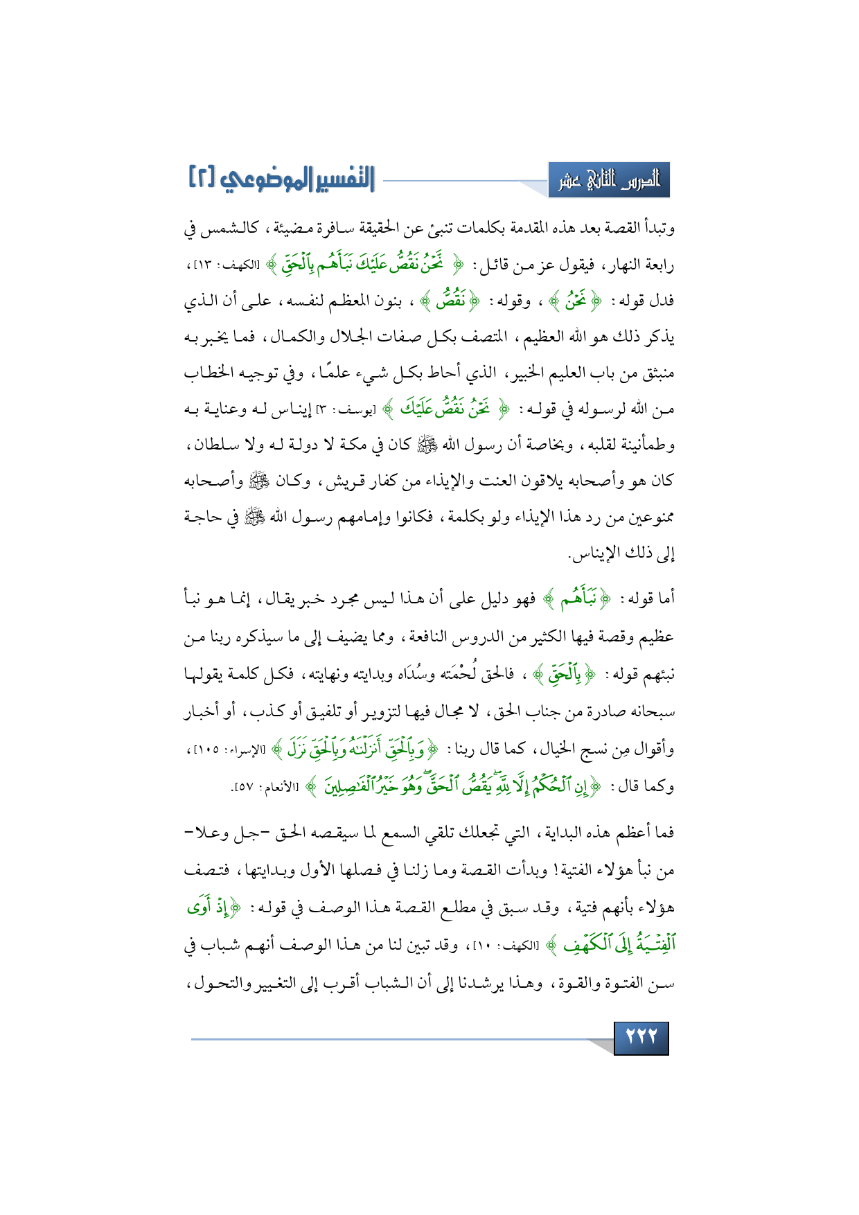 وتبدأ القصة بعد هذه المقدمة، بكلمات تنبئ عن الحقيقة سافرة مضيئة، كالشمس في رابعة النهار، فيقول عز من قائل: {نَحْنُ نَقُصُّ عَلَيْكَ نَبَأَهُمْ بِالْحَقِّ} (الكهف: 13) فدل قوله: {نَحْنُ}، وقوله: {نَقُصُّ}، بنون المعظم لنفسه، على أن الذي يذكر ذلك هو الله العظيم، المتصف بكل صفات الجلال والكمال، فما يخبر به منبثق من باب العليم الخبير، الذي أحاط بكل شيء علمًا، وفي توجيه الخطاب من الله لرسوله في قوله: {نَحْنُ نَقُصُّ عَلَيْكَ} (يوسف: 3) إيناس له وعناية به وتطمين لقلبه.