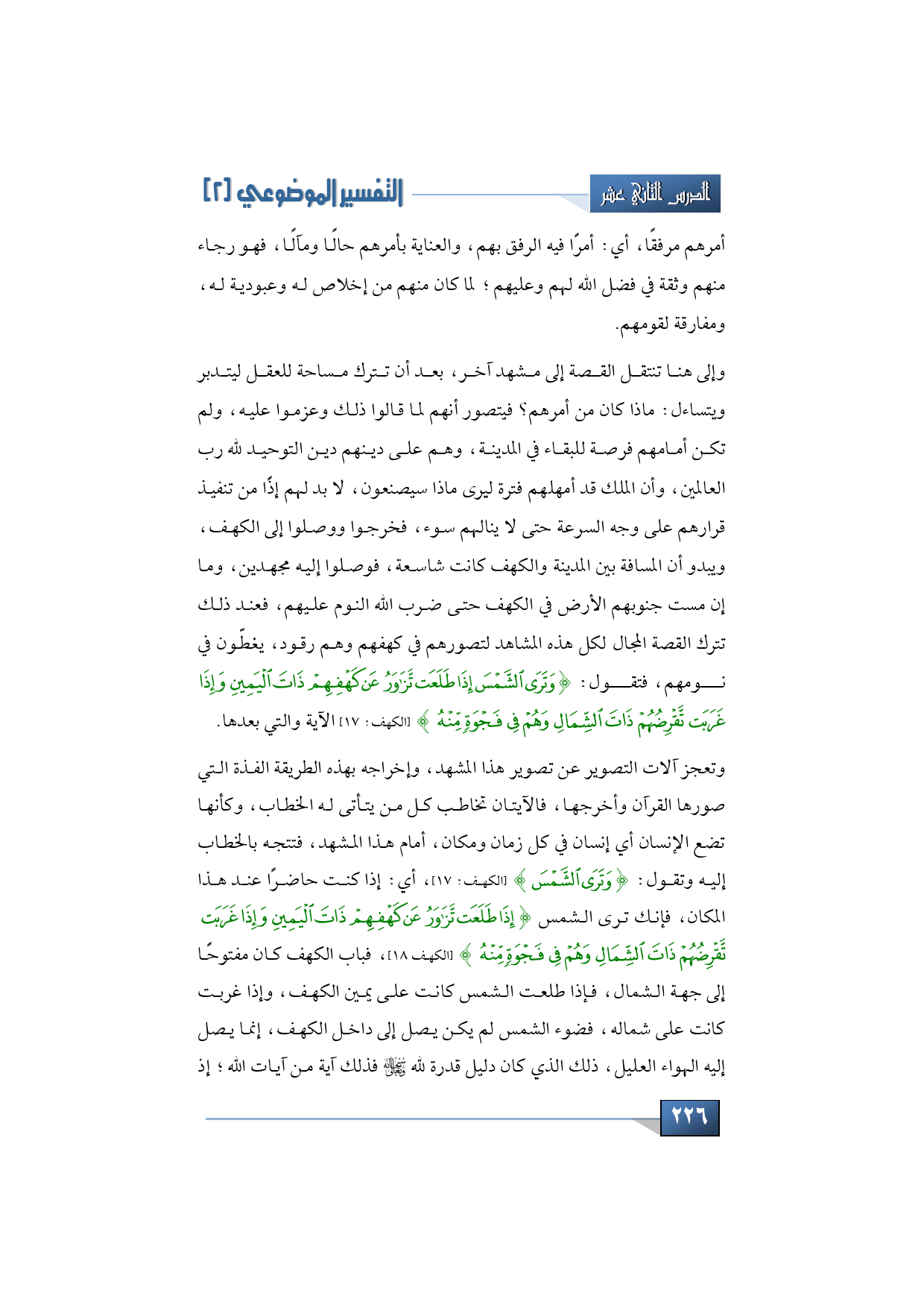 وتعجز آلات التصوير وفنانو الإخراج عن تصوير هذا المشهد، وإخراجه بهذه الطريقة الفذة التي صورها القرآن وأخرجها، فالآيتان تخاطب كل من يتأتى له الخطاب، وكأنها تضع الإنسان أي إنسان في كل زمان ومكان، أمام هذا المشهد، فتتجه بالخطاب إليه وتقول: {وَتَرَى الشَّمْسَ} (الكهف: 17) أي: إذا كنت حاضرًا عند هذا المكان، فإنك ترى الشمس إذا طلعت تزاور عن كهفهم ذات اليمين، وإذا غربت تقرضهم ذات الشمال وهم في فجوة منه، فباب الكهف كان مفتوحًا إلى جهة الشمال، فإذا طلعت الشمس كانت على يمين الكهف، وإذا غربت كانت على شماله، فضوء الشمس لم يكن يصل إلى داخل الكهف، إنما يصل إليه الهواء العليل، ذلك الذي كان دليل قدرة لله -سبحانه وتعالى، فذلك آية من آيات الله؛ إذ