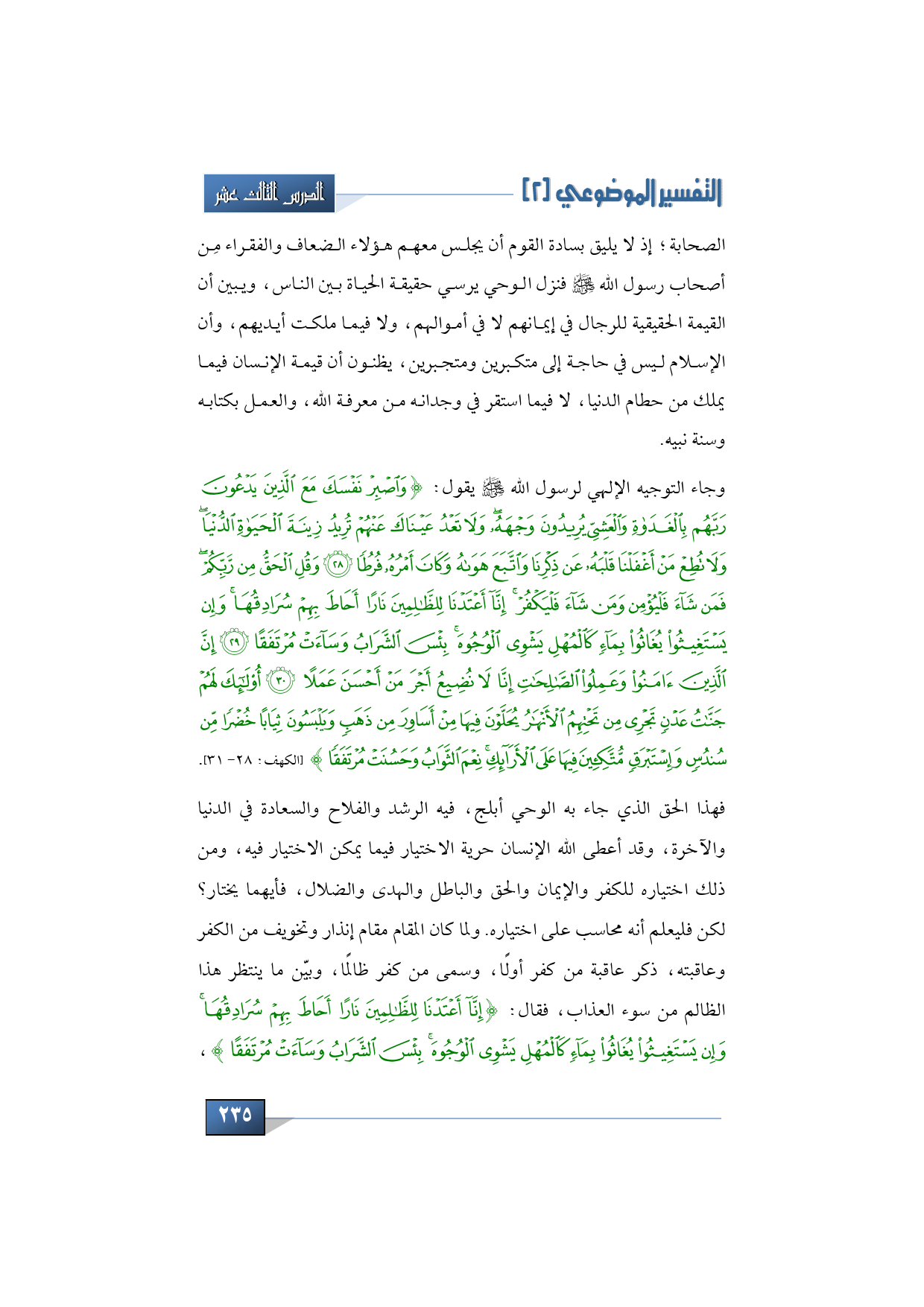 وجاء التوجيه الإلهي لرسول الله -صلى الله عليه وسلم- يقول: {وَاصْبِرْ نَفْسَكَ مَعَ الَّذِينَ يَدْعُونَ رَبَّهُمْ بِالْغَدَاةِ وَالْعَشِيِّ يُرِيدُونَ وَجْهَهُ وَلَا تَعْدُ عَيْنَاكَ عَنْهُمْ تُرِيدُ زِينَةَ الْحَيَاةِ الدُّنْيَا وَلَا تُطِعْ مَنْ أَغْفَلْنَا قَلْبَهُ عَنْ ذِكْرِنَا وَاتَّبَعَ هَوَاهُ وَكَانَ أَمْرُهُ فُرُطًا * وَقُلِ الْحَقُّ مِنْ رَبِّكُمْ فَمَنْ شَاءَ فَلْيُؤْمِنْ وَمَنْ شَاءَ فَلْيَكْفُرْ إِنَّا أَعْتَدْنَا لِلظَّالِمِينَ نَارًا أَحَاطَ بِهِمْ سُرَادِقُهَا وَإِنْ يَسْتَغِيثُوا يُغَاثُوا بِمَاءٍ كَالْمُهْلِ يَشْوِي الْوُجُوهَ بِئْسَ الشَّرَابُ وَسَاءَتْ مُرْتَفَقًا * إِنَّ الَّذِينَ آمَنُوا وَعَمِلُوا الصَّالِحَاتِ إِنَّا لَا نُضِيعُ أَجْرَ مَنْ أَحْسَنَ عَمَلًا * أُولَئِكَ لَهُمْ جَنَّاتُ عَدْنٍ تَجْرِي مِنْ تَحْتِهِمُ الْأَنْهَارُ يُحَلَّوْنَ فِيهَا مِنْ أَسَاوِرَ مِنْ ذَهَبٍ وَيَلْبَسُونَ ثِيَابًا خُضْرًا مِنْ سُنْدُسٍ وَإِسْتَبْرَقٍ مُتَّكِئِينَ فِيهَا عَلَى الْأَرَائِكِ نِعْمَ الثَّوَابُ وَحَسُنَتْ مُرْتَفَقًا} (الكهف: 28 - 31).