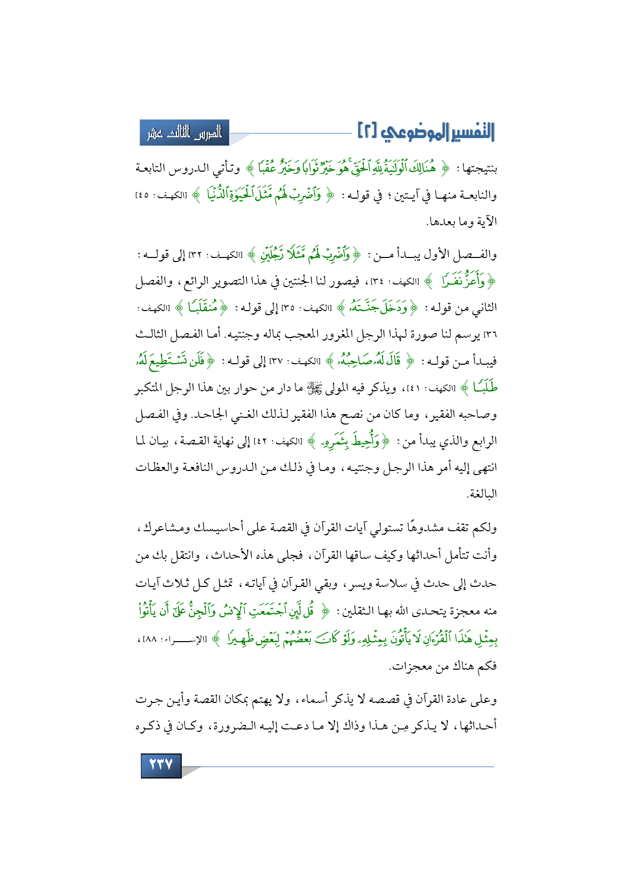 بنتيجتها: {هُنَالِكَ الْوَلَايَةُ لِلَّهِ الْحَقِّ هُوَ خَيْرٌ ثَوَابًا وَخَيْرٌ عُقْبًا} وتأتي الدروس التابعة والنابعة منها في آيتين في قوله: {وَاضْرِبْ لَهُمْ مَثَلَ الْحَيَاةِ الدُّنْيَا} (الكهف: 45) الآية وما بعدها.