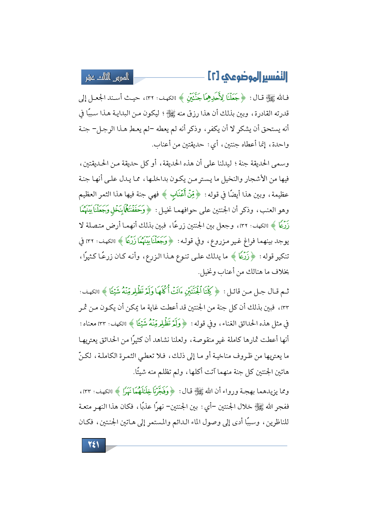 وسمى الحديقة جنة ليدلنا على أن هذه الحديقة، أو كل حديقة من الحديقتين، فيها من الأشجار والنخيل ما يستر من يكون بداخلها، مما يدل على أنها جنة عظيمة، وبين هذا أيضًا في قوله: {مِنْ أعْنَابٍ} فهي جنة فيها هذا الثمر العظيم وهو العنب، وذكر أن الجنتين على حوافهما نخيل: {حَفَفْنَاهُمَا بِنَخْلٍ وَجَعَلْنَا بَيْنَهُمَا زَرْعًا} (الكهف: 32)، جعل بين الجنتين زرعًا، فبين بذلك أنها أرض متصلة لا يوجد بينها فراغ غير مزروع، وفي قوله: {جَعَلْنَا بَيْنَهُمَا زَرْعًا} (الكهف: 32) في تنكير قوله: {زَرْعًا} ما يدلك على تنوع هذا الزرع، وأنه كان زرعًا كثيرًا، بخلاف ما هنالك من أعناب ونخيل.