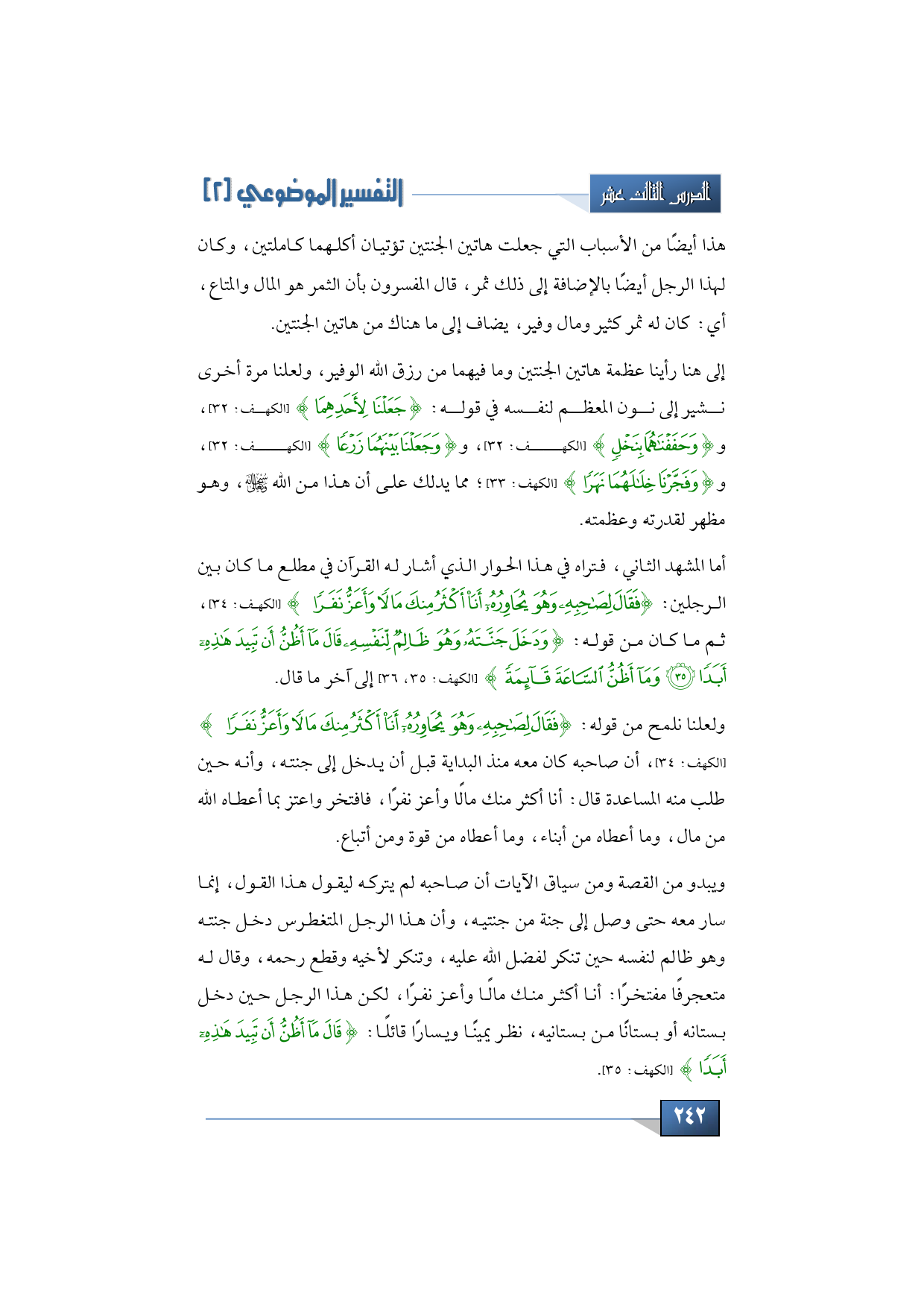 لعلكم تلمحون معي من قوله: {فَقَالَ لِصَاحِبِهِ وَهُوَ يُحَاوِرُهُ أَنَا أَكْثَرُ مِنْكَ مَالًا وَأَعَزُّ نَفَرًا} (الكهف: 34) أن صاحبه كان معه من البداية قبل أن يدخل إلى جنته، وأنه حين طلب منه المساعدة قال: أنا أكثر منك مالًا وأعز نفرًا، فافتخر واعتز بما أعطاه الله من مال، وما أعطاه من أبناء، وما أعطاه من قوة ومن أتباع.