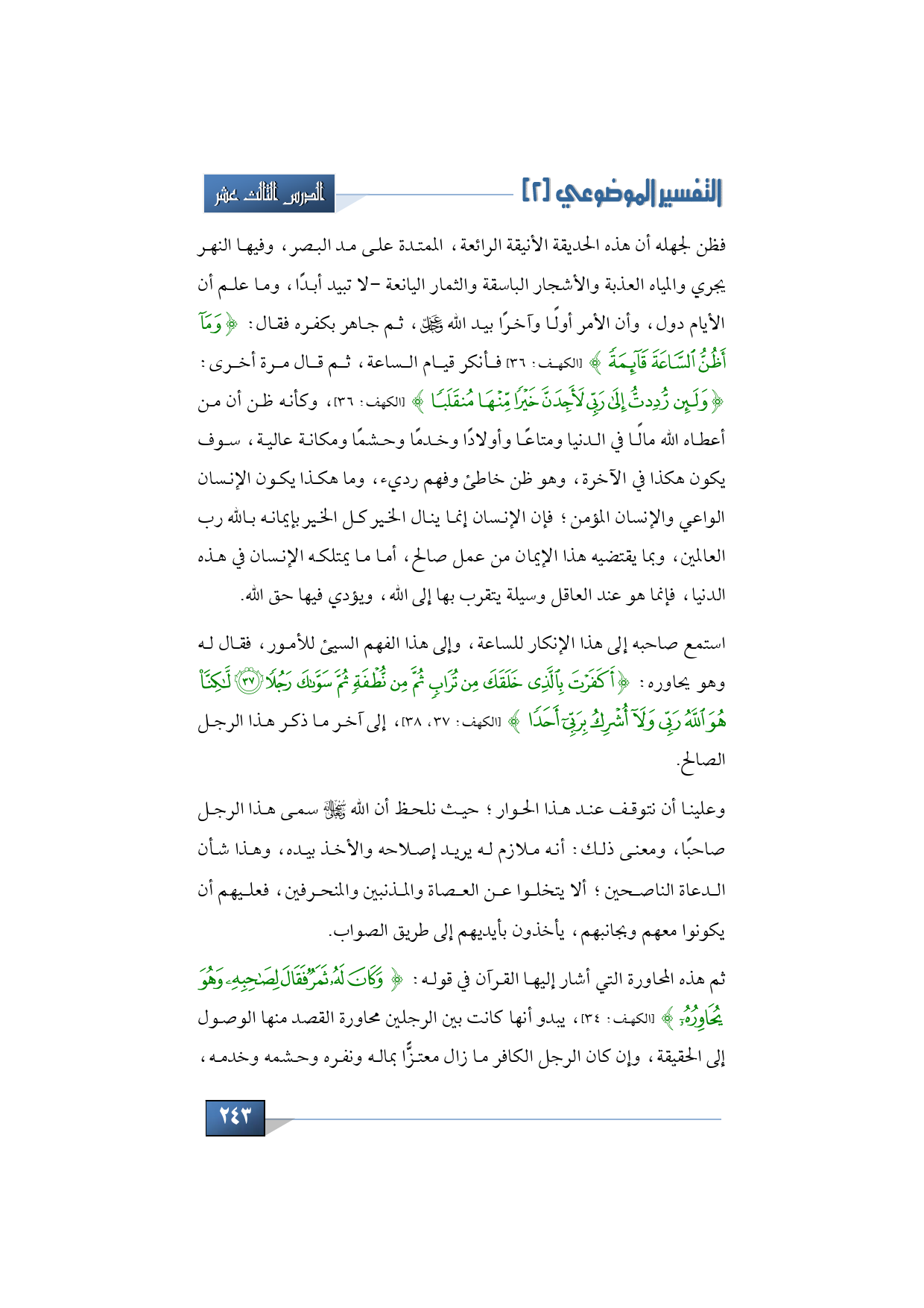 استمع صاحبه إلى هذا الإنكار للساعة، وإلى هذا الفهم السيئ للأمور، فقال له وهو يحاوره: {أَكَفَرْتَ بِالَّذِي خَلَقَكَ مِنْ تُرَابٍ ثُمَّ مِنْ نُطْفَةٍ ثُمَّ سَوَّاكَ رَجُلًا * لَكِنَّا هُوَ اللَّهُ رَبِّي وَلَا أُشْرِكُ بِرَبِّي أَحَدً} (الكهف: 37، 38) إلى آخر ما ذكر هذا الرجل الصالح، وعلينا أن نتوقف عند هذا الحوار: