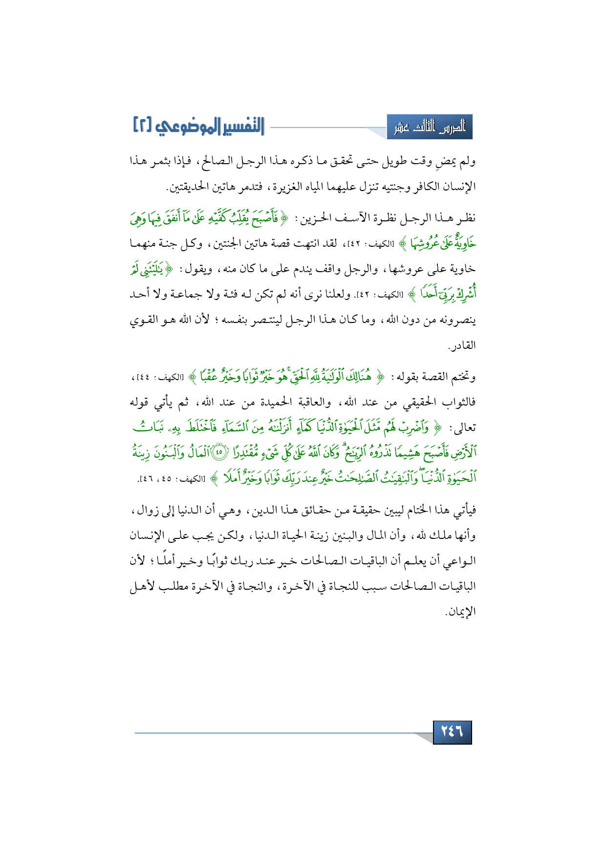 وتختم القصة بقوله: {هُنَالِكَ الْوَلَايَةُ لِلَّهِ الْحَقِّ هُوَ خَيْرٌ ثَوَابًا وَخَيْرٌ عُقْبًا} (الكهف: 44) فالثواب الحقيقي من عند الله، والعاقبة الحميدة من عند الله، ثم يأتي قوله تعالى: {وَاضْرِبْ لَهُمْ مَثَلَ الْحَيَاةِ الدُّنْيَا كَمَاءٍ أَنْزَلْنَاهُ مِنَ السَّمَاءِ فَاخْتَلَطَ بِهِ نَبَاتُ الْأَرْضِ فَأَصْبَحَ هَشِيمًا تَذْرُوهُ الرِّيَاحُ وَكَانَ اللَّهُ عَلَى كُلِّ شَيْءٍ مُقْتَدِرًا * الْمَالُ وَالْبَنُونَ زِينَةُ الْحَيَاةِ الدُّنْيَا وَالْبَاقِيَاتُ الصَّالِحَاتُ خَيْرٌ عِنْدَ رَبِّكَ ثَوَابًا وَخَيْرٌ أَمَلًا} (الكهف: 45، 46).