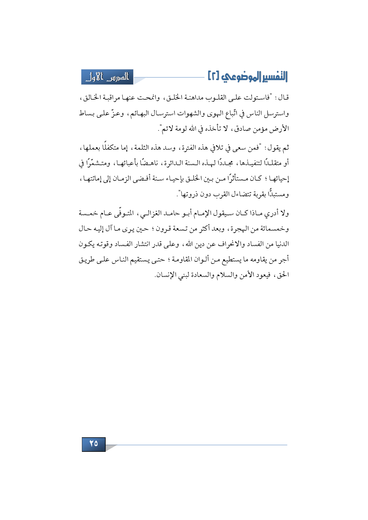 قال: "فاستولت على القلوب مداهنة الخلق وانمحت عنها مراقبة الخالق، واسترسل الناس في اتّباع الهوى والشهوات استرسال البهائم، وعزّ على بساط الأرض مؤمن صادق، لا تأخذه في الله لومة لائم"، ثم يقول: "فمن سعى في تلافي هذه الفترة، وسد هذه الثلمة، إما متكفلًا بعملها، أو متقلدًا لتنفيذها، مجددًا لهذه السنة الدائرة، ناهضًا بأعبائها، ومتشمّرًا في إحيائها، كان مستأثرًا من بين الخلق بإحياء سنة أفضى الزمان إلى إماتتها، ومستبدًّا بقربة تتضاءل القرب دون ذروتها".