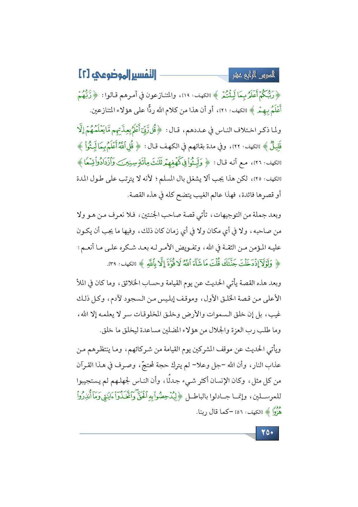 ولما ذكر اختلاف الناس في عددهم قال: {قُلْ رَبِّي أَعْلَمُ بِعِدَّتِهِمْ مَا يَعْلَمُهُمْ إِلَّا قَلِيلٌ} (الكهف: 22) وفي مدة بقائهم في الكهف قال: {قُلِ اللَّهُ أَعْلَمُ بِمَا لَبِثُوا} (الكهف: 26) مع أنه قال: {وَلَبِثُوا فِي كَهْفِهِمْ ثَلَاثَ مِائَةٍ سِنِينَ وَازْدَادُوا تِسْعًا} (الكهف: 25) لكن هذا يجب ألا يشغل بال المسلم؛ لأنه لا يترتب على طول المدة أو قصرها فائدة، فهذا عالم الغيب يتضح كله في هذه القصة.