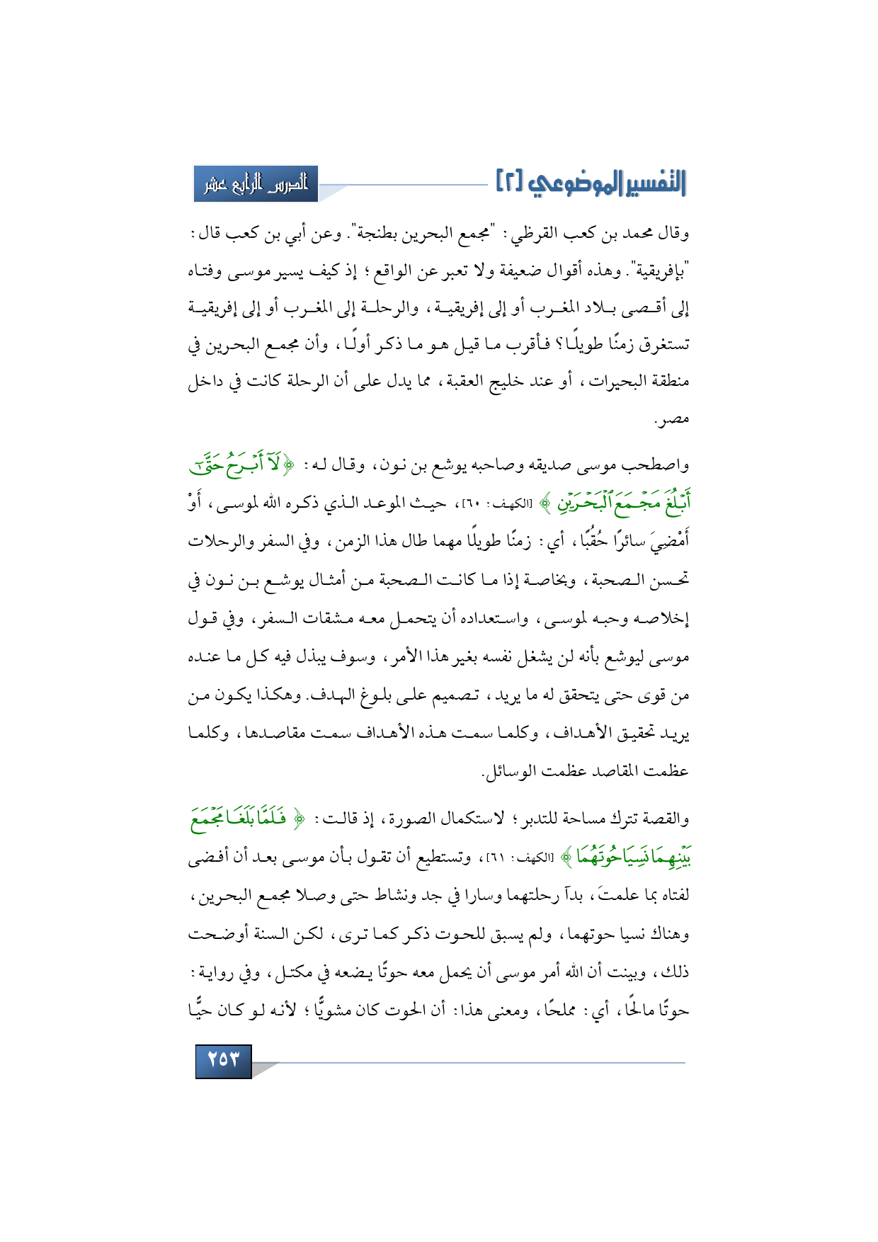 وقال محمد بن كعب القرظي: "مجمع البحرين بطنجة". وعن أبي بن كعب قال: "بإفريقية". وهذه أقوال ضعيفة ولا تعبر عن الواقع؛ إذ كيف يسير موسى وفتاه إلى أقصى بلاد المغرب أو إلى إفريقية، والرحلة إلى المغرب أو إلى إفريقية تستغرق زمنًا طويلًا، فأقرب ما قيل هو ما ذكر أولًا، وأن مجمع البحرين في منطقة البحيرات، أو عند خليج العقبة، مما يدل على أن الرحلة كانت في داخل مصر.
