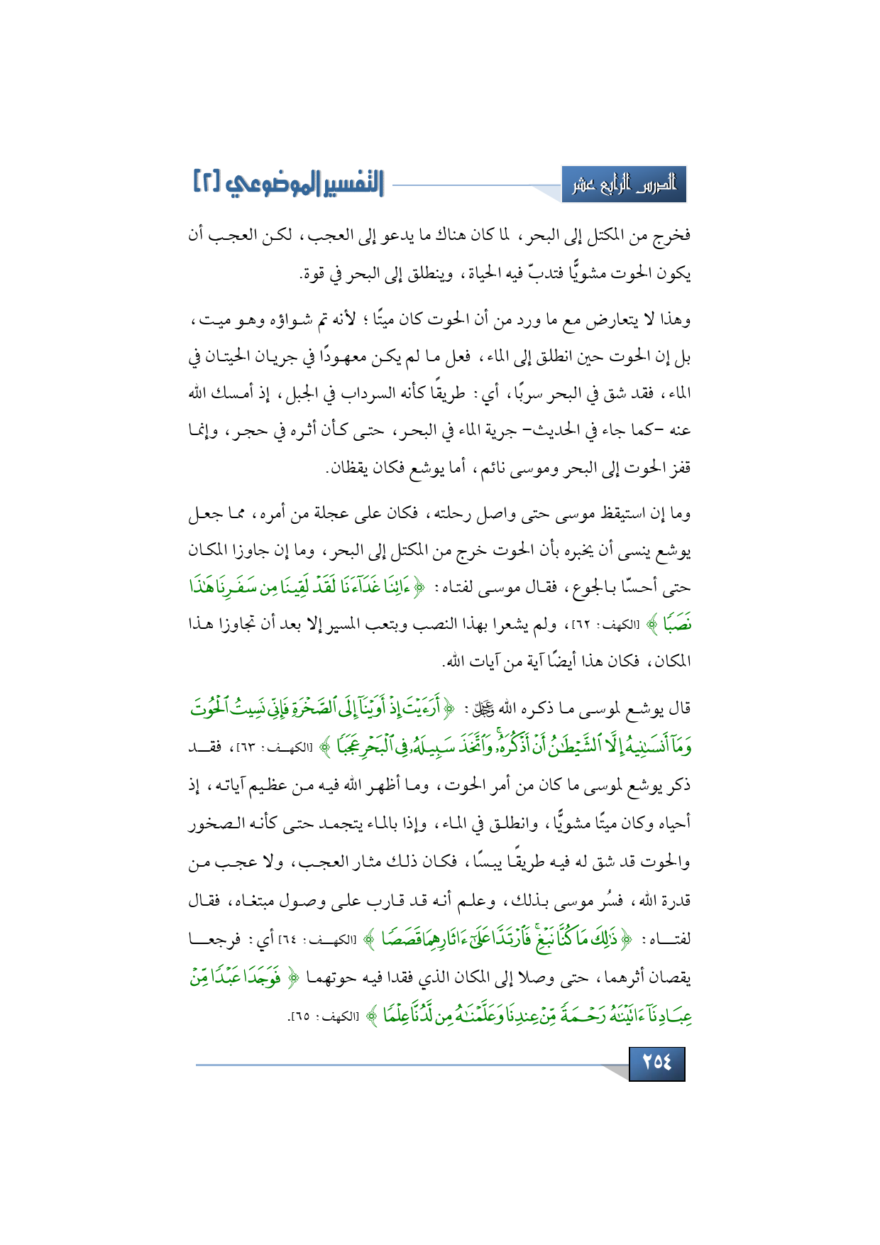 وهذا لا يتعارض مع ما ورد من أن الحوت كان ميتًا؛ لأنه تم شواؤه وهو ميت، بل إن الحوت حين انطلق إلى الماء، فعل ما لم يكن معهودًا في جريان الحيتان في الماء، فقد شق في البحر سربًا، أي: طريقًا كأنه السرداب في الجبل، إذ أمسك الله عنه كما جاء في الحديث جِرْيَة الماء في البحر، حتى كأن أثره في حجر، وإنما قفز الحوت إلى البحر وموسى نائم، أما يوشع فكان يقظان.