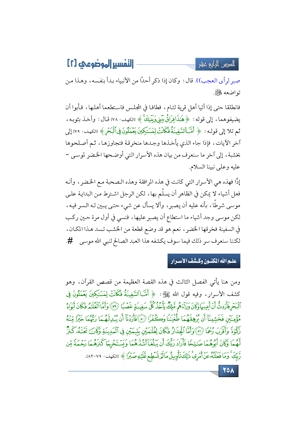 ومن هنا يأتي الفصل الثالث في هذه القصة العظيمة من قصص القرآن، وهو كشف الأسرار، وفيه قول الله -سبحانه وتعالى-: {أَمَّا السَّفِينَةُ فَكَانَتْ لِمَسَاكِينَ يَعْمَلُونَ فِي الْبَحْرِ فَأَرَدْتُ أَنْ أَعِيبَهَا وَكَانَ وَرَاءَهُمْ مَلِكٌ يَأْخُذُ كُلَّ سَفِينَةٍ غَصْبًا * وَأَمَّا الْغُلَامُ فَكَانَ أَبَوَاهُ مُؤْمِنَيْنِ فَخَشِينَا أَنْ يُرْهِقَهُمَا طُغْيَانًا وَكُفْرًا * فَأَرَدْنَا أَنْ يُبْدِلَهُمَا رَبُّهُمَا خَيْرًا مِنْهُ زَكَاةً وَأَقْرَبَ رُحْمًا * وَأَمَّا الْجِدَارُ فَكَانَ لِغُلَامَيْنِ يَتِيمَيْنِ فِي الْمَدِينَةِ وَكَانَ تَحْتَهُ كَنْزٌ لَهُمَا وَكَانَ أَبُوهُمَا صَالِحًا فَأَرَادَ رَبُّكَ أَنْ يَبْلُغَا أَشُدَّهُمَا وَيَسْتَخْرِجَا كَنْزَهُمَا رَحْمَةً مِنْ رَبِّكَ وَمَا فَعَلْتُهُ عَنْ أَمْرِي ذَلِكَ تَأْوِيلُ مَا لَمْ تَسْطِعْ عَلَيْهِ صَبْرًا} (الكهف: 79 - 82).