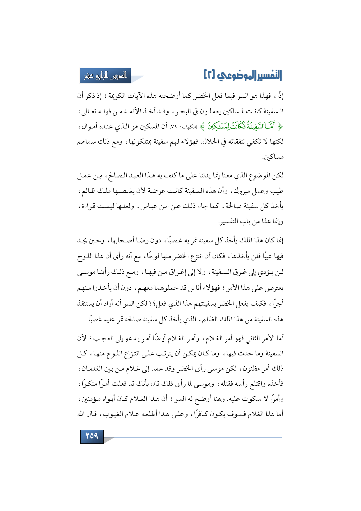 فهذا هو السر فيما فعل الخضر، كما أوضحته هذه الآيات الكريمة؛ إذ ذكر أن السفينة كانت لمساكين يعملون في البحر، وقد أخذ الأئمة من قوله تعالى: {أَمَّا السَّفِينَةُ فَكَانَتْ لِمَسَاكِينَ} (الكهف: 79) أن المسكين هو الذي عنده أموال، ولكنها لا تكفي لنفقاته في الحلال، فهؤلاء لهم سفينة يمتلكونها، ومع ذلك سماهم مساكين.