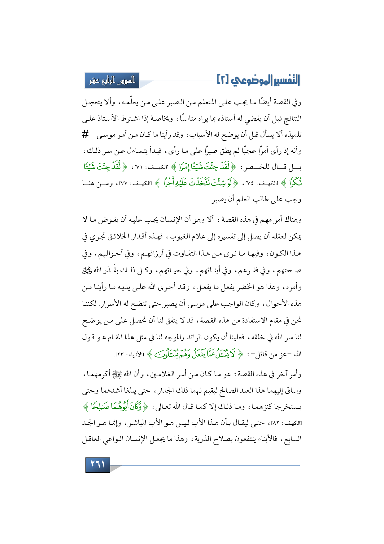 وكان الواجب على موسى أن يصبر حتى تتضح له الأسرار، لكننا نحن في مقام الاستفادة من هذه القصة، قد لا يتفق لنا أن نحصل على من يوضح لنا سر الله في خلقه، فعلينا أن يكون الرائد والموجه لنا في مثل هذا المقام، هو قول الله -عز من قائل-: {لَا يُسْأَلُ عَمَّا يَفْعَلُ وَهُمْ يُسْأَلُونَ} (الأنبياء: 23) وأمر آخر في هذه القصة هو ما كان من أمر الغلامين، وأن الله -سبحانه وتعالى- أكرمهما، وساق إليهما هذا العبد الصالح ليقيم لهما ذلك الجدار، حتى يبلغا أشدهما، وحتى يستخرجا كنزهما، وما ذلك إلا كما قال الله تعالى: {وَكَانَ أَبُوهُمَا صَالِحًا} (الكهف: 82).