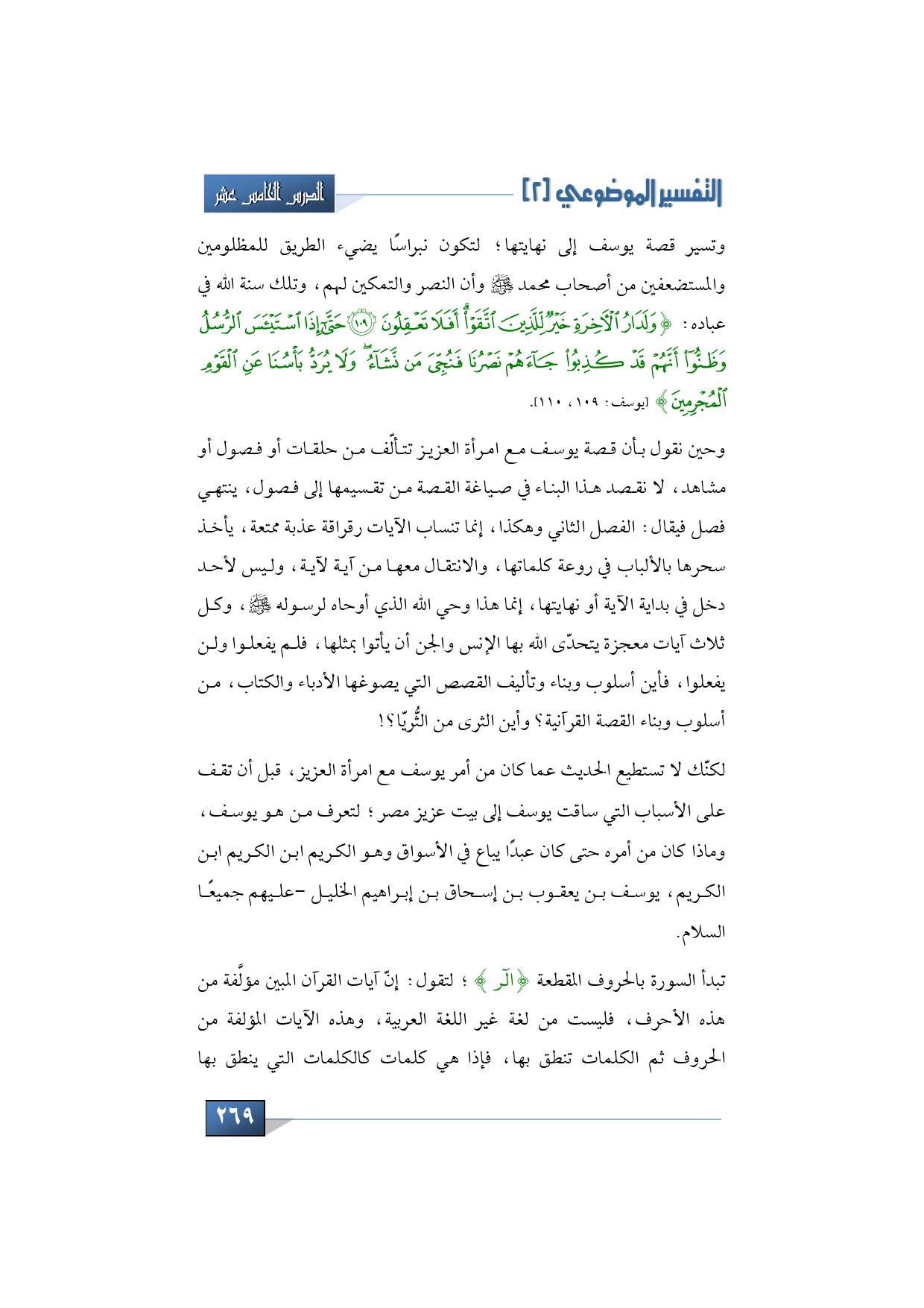 تبدأ السورة كما ذكرنا بالحروف المقطعة {الر}؛ لتقول: إنّ آيات القرآن المبين مؤلَّفة من هذه الأحرف، فليست من لغة غير اللغة العربية، وهذه الآيات المؤلفة من الحروف ثم الكلمات، تنطق بها فإذا هي كلمات كالكلمات التي ينطق بها