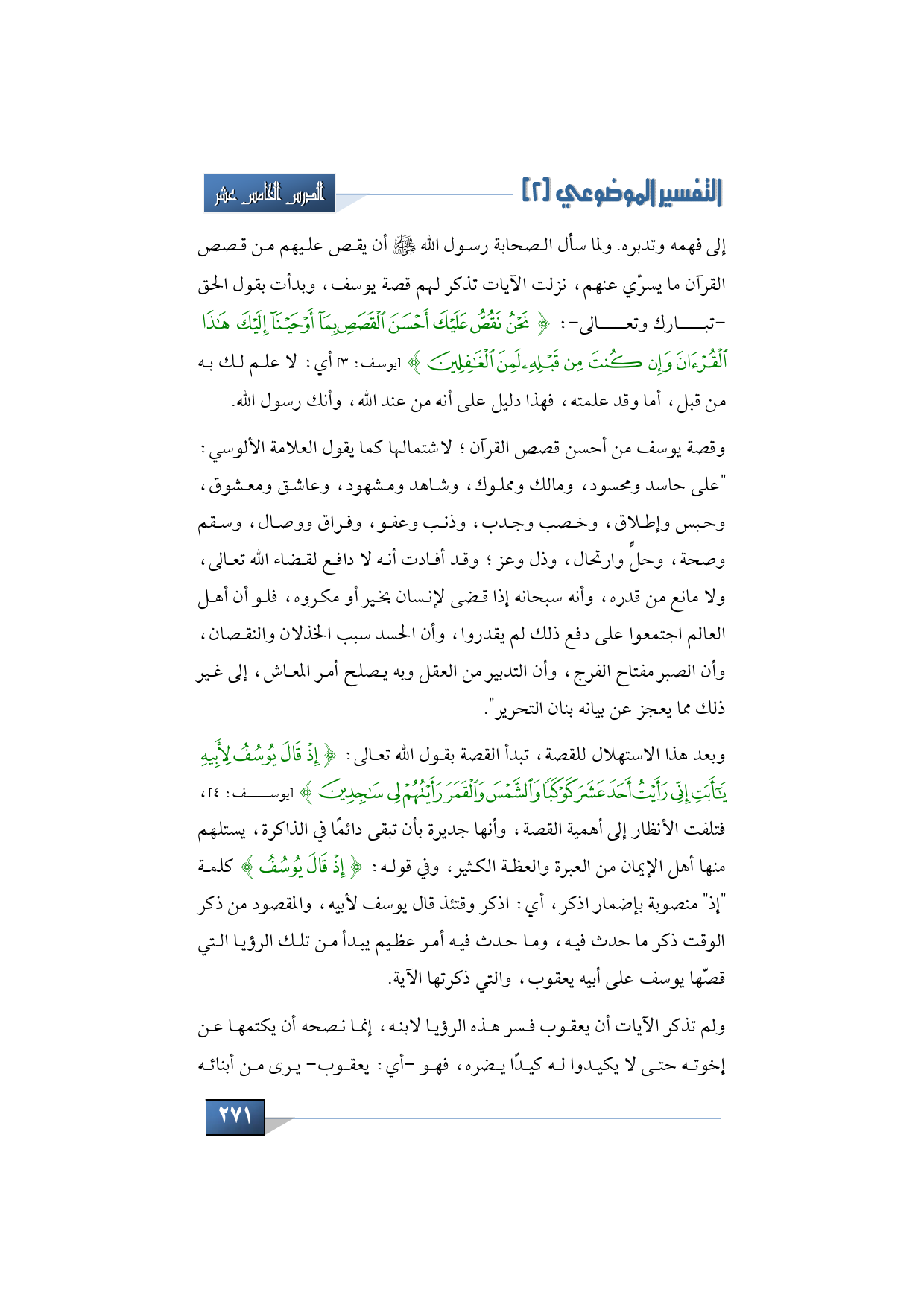 أوجه أن قصة يوسف من أحسن قصص القرآن، اشتمالها كما يقول العلامة الألوسي: "على حاسد ومحسود، ومالك ومملوك، وشاهد ومشهود، وعاشق ومعشوق، وحبس وإطلاق، وخصب وجدب، وذنب وعفو، وفراق ووصال، وسقم وصحة، وحلٍّ وارتحال، وذل وعز، وقد أفادت أنه لا دافع لقضاء الله تعالى، ولا مانع من قدره، وأنه سبحانه إذا قضى لإنسان بخير ومكروه، فلو أن أهل العالم اجتمعوا على دفع ذلك لم يقدروا، وأن الحسد سبب الخذلان والنقصان، وأن الصبر مفتاح الفرج، وأن التدبير من العقل، وبه يصلح أمر المعاش، إلى غير ذلك مما يعجز عن بيانه بنان التحرير".