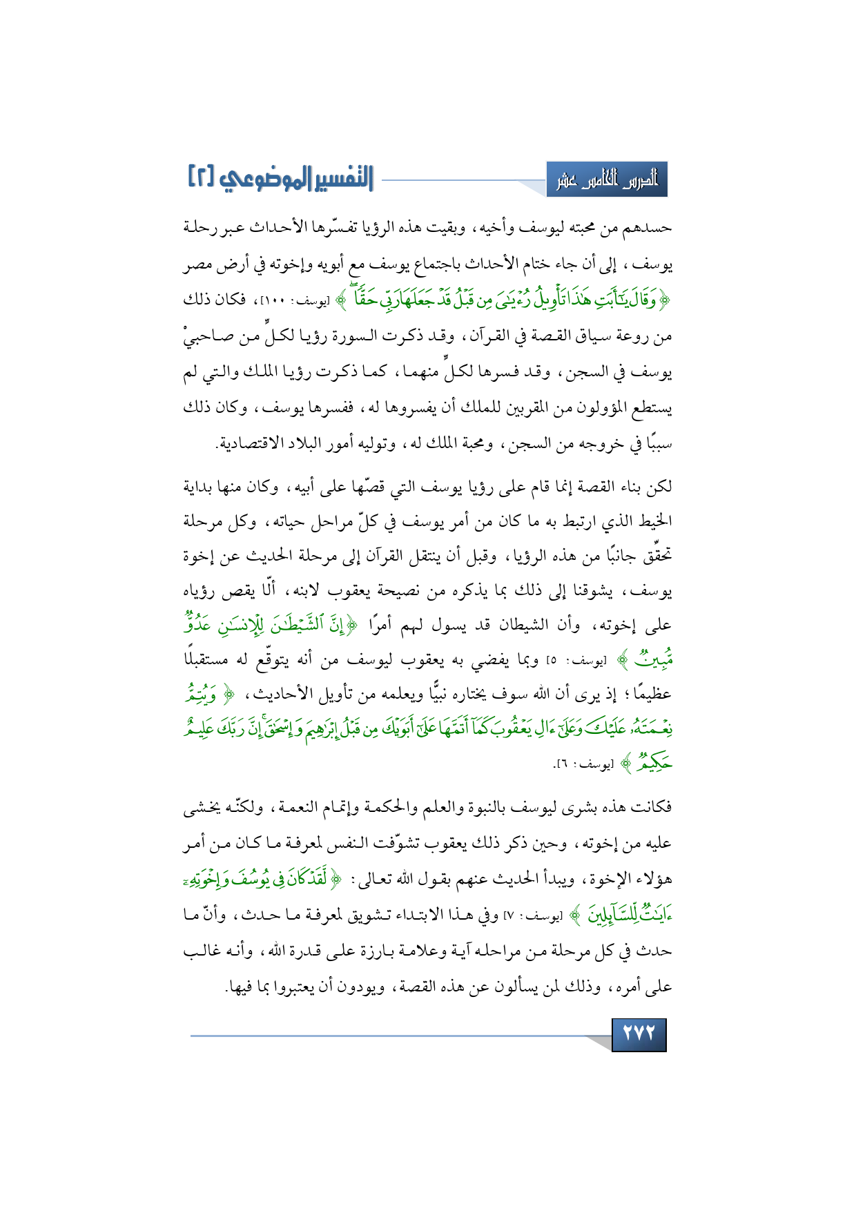 حسدهم من محبة أبيهم ليوسف وأخيه، وبقيت هذه الرؤيا تفسّرها الأحداث عبر رحلة يوسف، إلى أن جاء ختام الأحداث باجتماع يوسف مع أبويه وإخوته في أرض مصر {وَقَالَ يَا أَبَتِ هَذَا تَأْوِيلُ رُؤْيَايَ مِنْ قَبْلُ قَدْ جَعَلَهَا رَبِّي حَقًّا} (يوسف: 100) فكان ذلك من روعة سياق القصة في القرآن، وقد ذكرت السورة رؤيا لكلٍّ من صاحبيْ يوسف في السجن، وقد فسرها لكلٍّ منهما، كما ذكرت رؤيا الملك والتي لم يستطع المؤولون من المقربين للملك أن يفسروها له، ففسرها يوسف، وكان ذلك سببًا في خروجه من السجن، ومحبة الملك له، وتوليه أمور البلاد الاقتصادية.