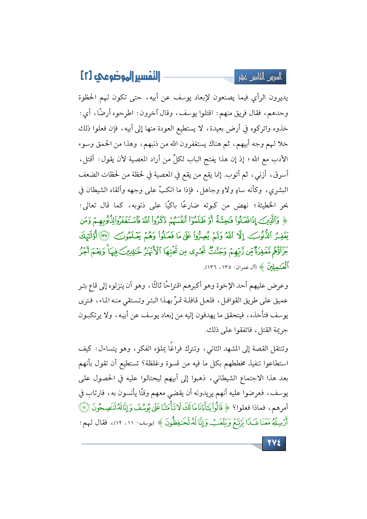 يديرون الرأي فيما يصنعون لإبعاد يوسف عن أبيه، حتى تكون لهم الحظوة وحدهم، قال فريق منهم: اقتلوا يوسف، وقال آخرون: اطرحوه أرضًا، أي خذوه واتركوه في أرض بعيدة لا يستطيع العودة منها إلى أبيه، فإن فعلوا ذلك خلا لهم وجه أبيهم، ثم هناك يستغفرون الله من ذنبهم، وهذا من الحمق وسوء الأدب مع الله؛ إذ إن هذا يفتح الباب لكلِّ من أراد المعصية ليقول: أقتل أسرق أزني، ثم أتوب، إنما يقع من يقع في المعصية في لحظة من لحظات الضعف البشري، وكأنه ساهٍ ولاهٍ وجاهل، فإذا ما انكب على وجهه وألقاه الشيطان في بحر الخطيئة نهض من كبوته ضارعًا باكيًا على ذنوبه كما قال تعالى: {وَالَّذِينَ إِذَا فَعَلُوا فَاحِشَةً أَوْ ظَلَمُوا أَنْفُسَهُمْ ذَكَرُوا اللَّهَ فَاسْتَغْفَرُوا لِذُنُوبِهِمْ وَمَنْ يَغْفِرُ الذُّنُوبَ إِلَّا اللَّهُ وَلَمْ يُصِرُّوا عَلَى مَا فَعَلُوا وَهُمْ يَعْلَمُونَ * أُولَئِكَ جَزَاؤُهُمْ مَغْفِرَةٌ مِنْ رَبِّهِمْ وَجَنَّاتٌ تَجْرِي مِنْ تَحْتِهَا الْأَنْهَارُ خَالِدِينَ فِيهَا وَنِعْمَ أَجْرُ الْعَامِلِينَ} (آل عمران: 135، 136)