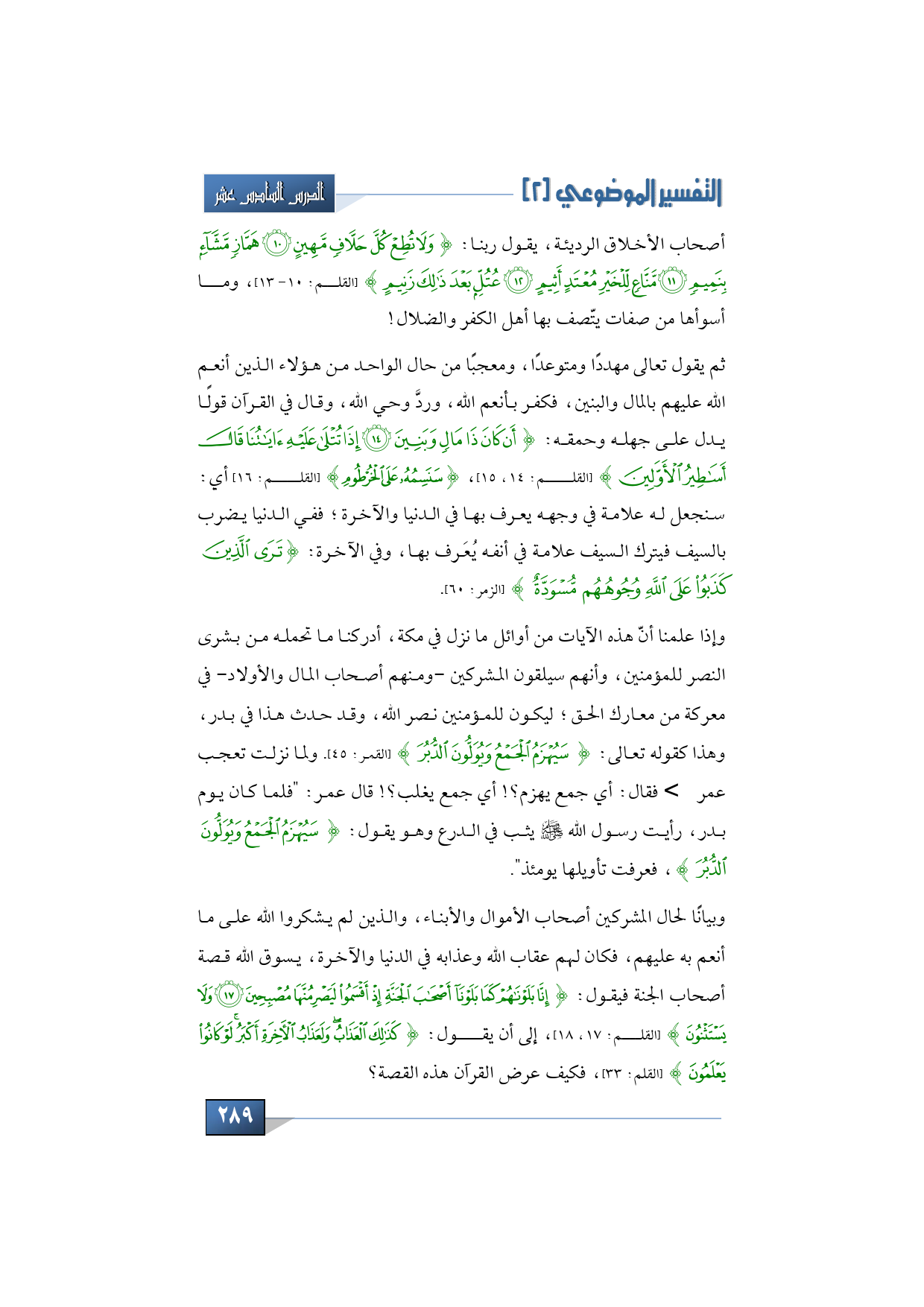 أصحاب الأخلاق الرديئة، يقول ربنا: {وَلَا تُطِعْ كُلَّ حَلَّافٍ مَهِينٍ * هَمَّازٍ مَشَّاءٍ بِنَمِيمٍ * مَنَّاعٍ لِلْخَيْرِ مُعْتَدٍ أَثِيمٍ * عُتُلٍّ بَعْدَ ذَلِكَ زَنِيمٍ} (القلم: 10 - 13) وما أسوأها من صفات يتّصف بها أهل الكفر والضلال، ثم يقول تعالى مهددًا ومتوعدًا ومعجِّبًا من حال الواحد من هؤلاء الذين أنعم الله عليهم بالمال والبنين، فكفر بأنعم الله، وردَّ وحي الله، وقال في القرآن قولًا يدل على جهله وحمقه: {أَنْ كَانَ ذَا مَالٍ وَبَنِينَ * إِذَا تُتْلَى عَلَيْهِ آيَاتُنَا قَالَ أَسَاطِيرُ الْأَوَّلِينَ} (القلم:14، 15) {سَنَسِمُهُ عَلَى الْخُرْطُومِ} (القلم: 16) أي: سنجعل له علامة في وجهه يعرف بها في الدنيا والآخرة.