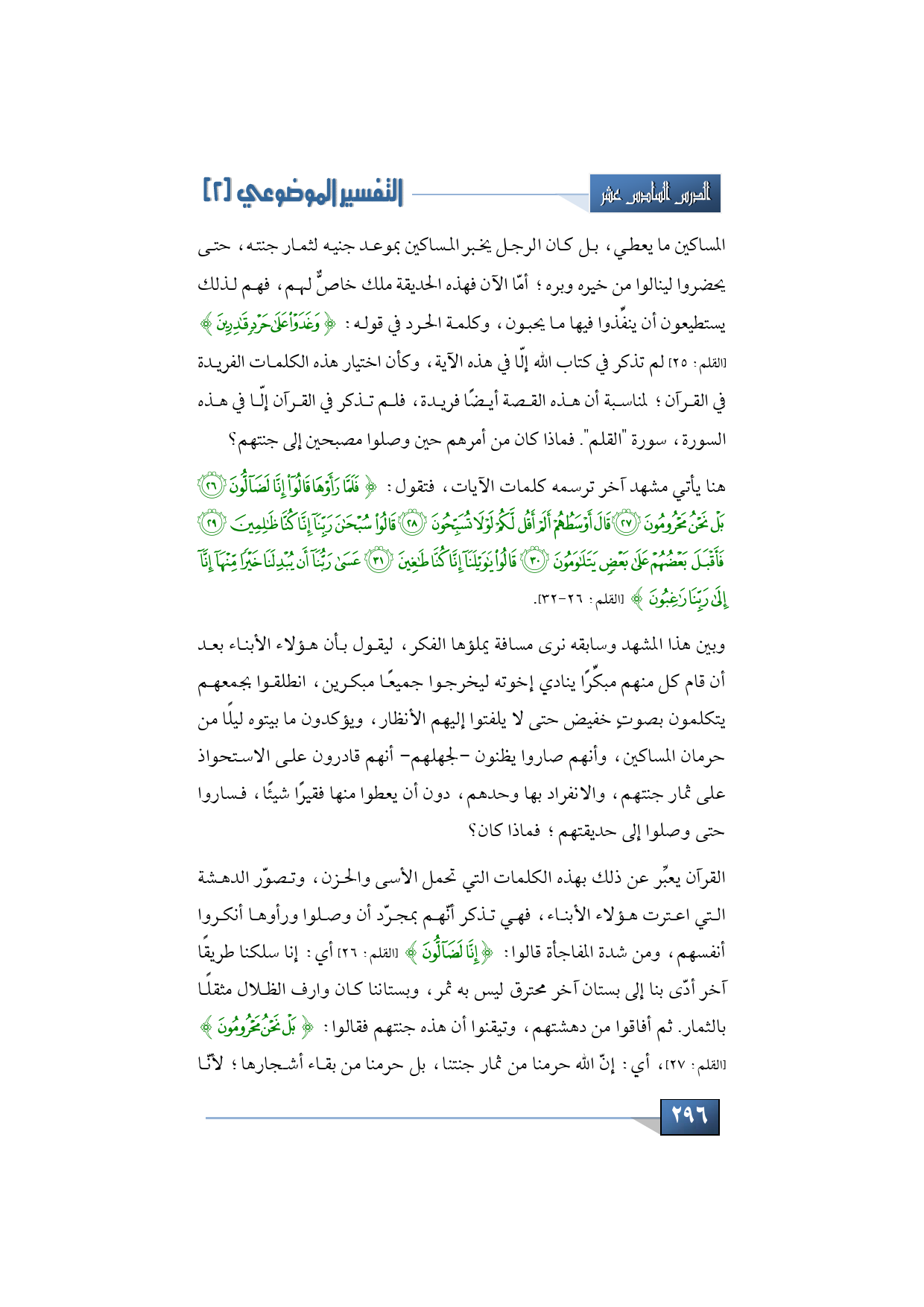 المساكين ما يعطي، بل كان الرجل يخبر المساكين بموعد جنيه لثمار جنته حتى يحضروا لينالوا من خيره وبره، أمّا الآن فهذه الحديقة ملك خاصٌّ لهم، فهم لذلك يستطيعون أن ينفِّذوا فيها ما يحبون، وكلمة الحرد في قوله: {وَغَدَوْا عَلَى حَرْدٍ قَادِرِينَ} (القلم: 25) لم تذكر في كتاب الله إلّا في هذه الآية، وكأن اختيار هذه الكلمات الفريدة في القرآن، لمناسبة أن هذه القصة أيضًا فريدة لم تذكر في القرآن إلّا في هذه السورة، سورة "القلم".