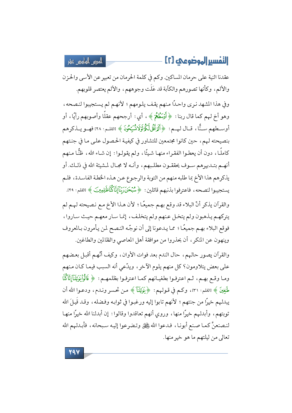 وكم في كلمة الحرمان من تعبير عن الأسى والحزن والألم، وكأنها تصورهم والكآبة قد علت وجوههم، والألم يعتصر قلوبهم، وفي هذا المشهد ترى واحدًا منهم يقف يلومهم أن لم يستجيبوا لنصحه، وهو أخ لهم كما قال ربنا: أوسطهم، أي أرجحهم عقلًا وأصوبهم رأيًا، أو أوسطهم سنًّا، قال لهم: {أَلَمْ أَقُلْ لَكُمْ لَوْلَا تُسَبِّحُونَ} (القلم: 28) فهو يذكرهم بنصيحته لهم حين كانوا مجتمعين للتشاور في كيفية الحصول على ما في جنتهم كاملًا، دون أن يعطوا الفقراء منها شيئًا، ولم يقولوا إن شاء الله، ظنًّا منهم أنهم بتدبيرهم سوف يحققون مطلبهم، وأنه لا مجال لمشيئة الله في ذلك، أو يذكرهم هذا الأخ بما طلبه منهم من التوبة والرجوع عن هذه الخطة الفاسدة، فلم يستجيبوا لنصحه، فاعترفوا بذنبهم قائلين: {سُبْحَانَ رَبِّنَا إِنَّا كُنَّا ظَالِمِينَ} (القلم: 29).