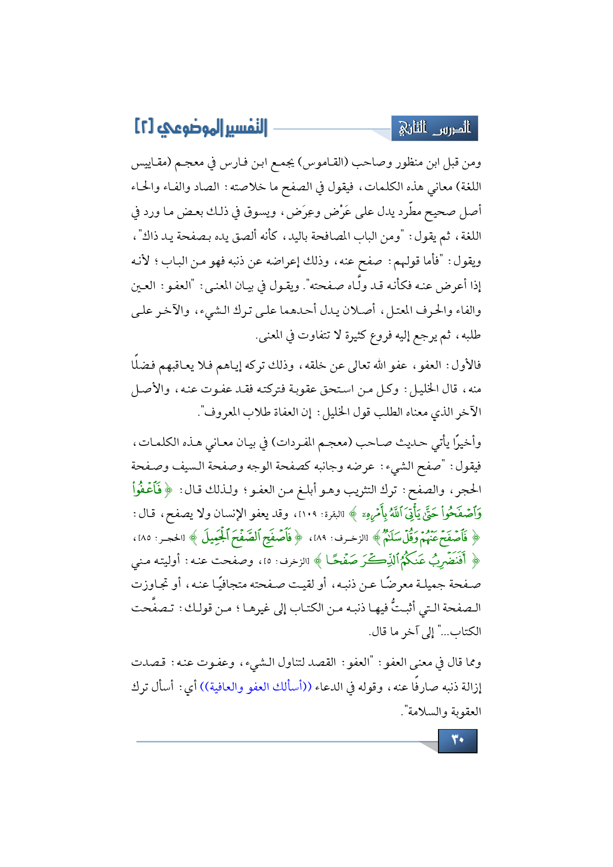 وأخيرًا يأتي حديث صاحب (معجمي المفردات) في بيان معاني هذه الكلمات فيقول: صفح الشيء عرضه وجانبه كصفحة الوجه وصفحة السيف، وصفحة الحجر والصفح ترك التثريب وهو أبلغ من العفو، ولذلك قال: {فَاعْفُوا وَاصْفَحُوا حَتَّى يَأْتِيَ اللَّهُ بِأَمْرِهِ}، وقد يعفو الإنسان ولا يصفح، قال: {فَاصْفَحْ عَنْهُمْ وَقُلْ سَلَامٌ}، {فَاصْفَحِ الصَّفْحَ الْجَمِيلَ}، {أَفَنَضْرِبُ عَنْكُمُ الذِّكْرَ صَفْحًا}، وصفحت عنه: أوليته مني صفحة جميلة معرضًا عن ذنبه، أو لقيته صفحته متجافيًا عنه، أو تجاوزت الصفحة التي أثبتُّ فيها ذنبه من الكتاب إلى غيرها من قولك: تصفَّحت الكتاب إلى آخر ما قال.