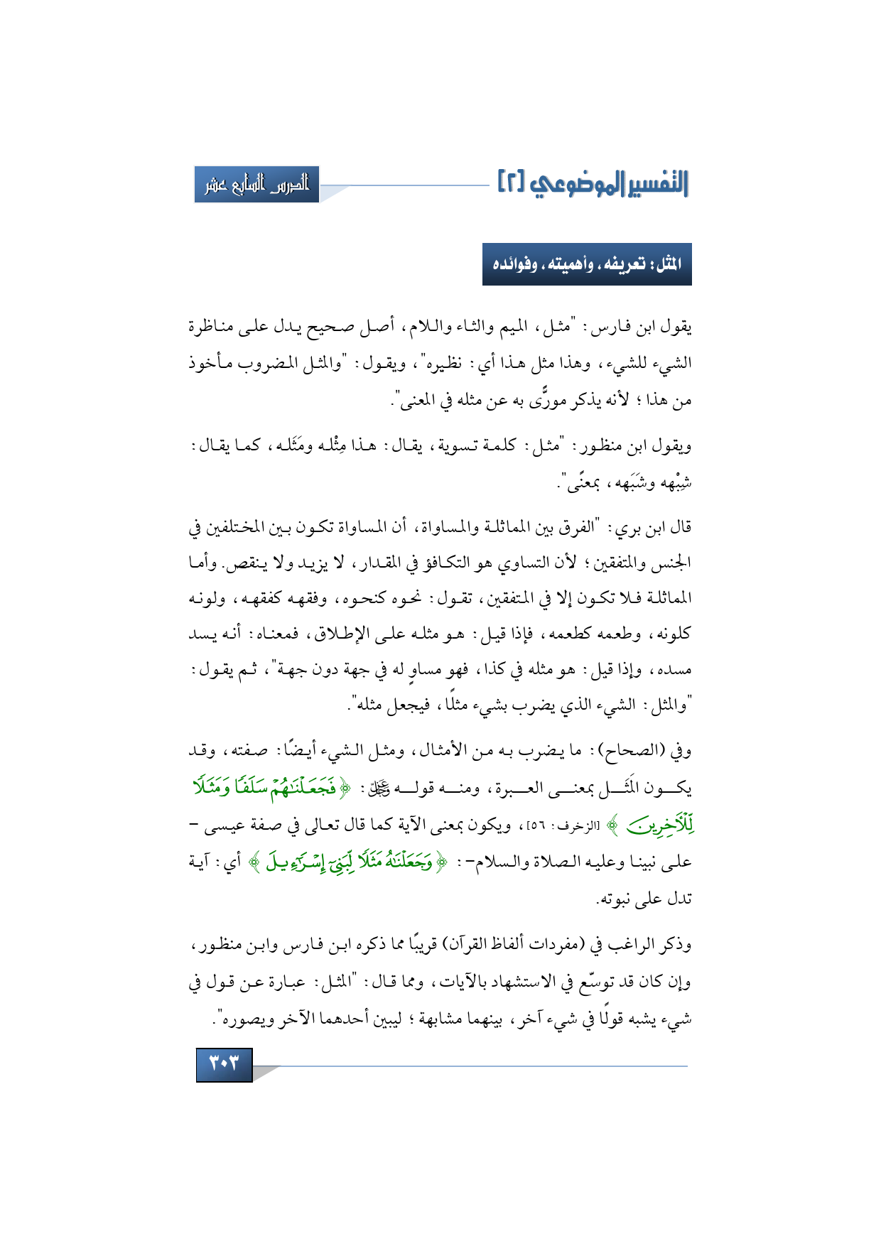 وذكر الراغب في (مفردات ألفاظ القرآن) قريبًا مما ذكره ابن فارس وابن منظور، وإن كان قد توسّع في الاستشهاد بالآيات، ومما قال: "المثل عبارة عن قول في شيء يشبه قولًا في شيء آخر، بينهما مشابهة؛ ليبين أحدهما الآخر ويصوره".