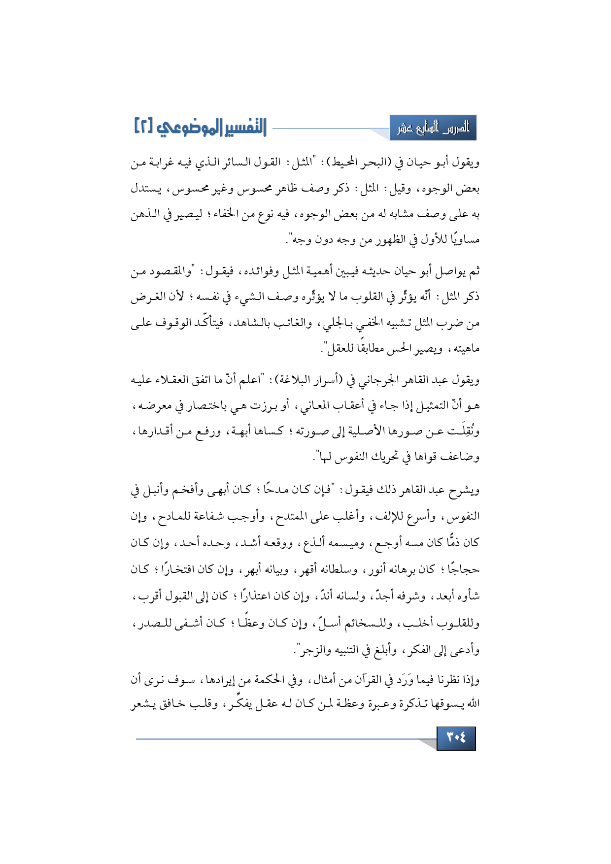 ويقول عبد القاهر الجرجاني في (أسرار البلاغة): "اعلم أنّ ما اتفق العقلاء عليه هو أنّ التمثيل إذا جاء في أعقاب المعاني، أو برزت هي باختصار في معرضه، ونُقِلَت عن صورها الأصلية إلى صورته، كساها أبهة، ورفع من أقدارها، وضاعف قواها في تحريك النفوس لها"، ويشرح عبد القاهر ذلك فيقول: "فإن كان مدحًا كان أبهى وأفخم وأنبل في النفوس، وأسرع للإلف، وأغلب على الممتدح، وأوجب شفاعة للمادح، وإن كان ذمًّا كان مسه أوجع، وميسمه ألذع، ووقعه أشد، وحده أحد، وإن كان حجاجًا، كان برهانه أنور، وسلطانه أقهر، وبيانه أبهر، وإن كان افتخارًا، كان شأوه أبعد، وشرفه أجد، ولسانه أند، وإن كان اعتذارًا كان إلى القبول أقرب، وللقلوب أخلب، وللسخائم أسل، وإن كان وعظًا، كان أشفى للصدر، وأدعى إلى الفكر، وأبلغ في التنبيه والزجر".