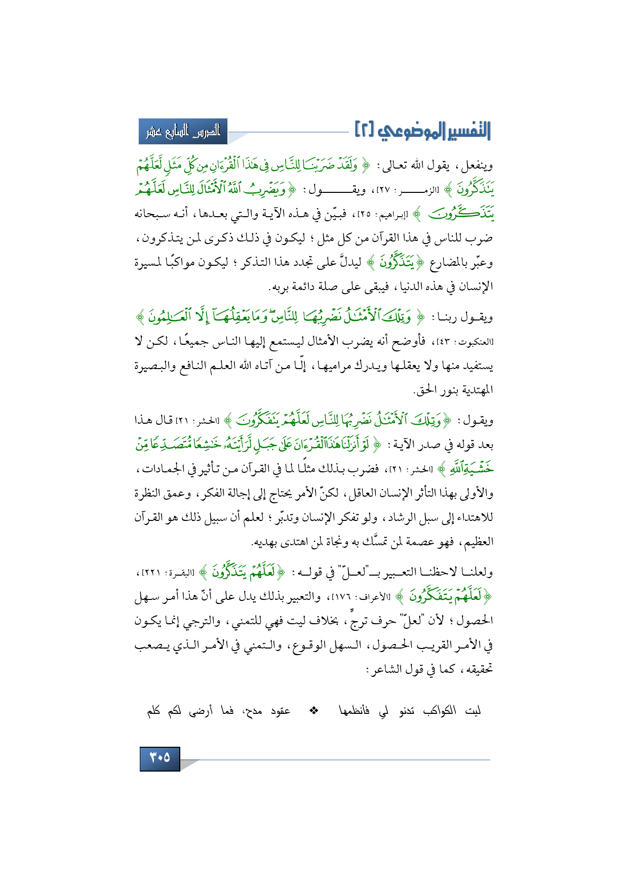 وينفعل، واقرءوا إن شئتم قول الله تعالى: {وَلَقَدْ ضَرَبْنَا لِلنَّاسِ فِي هَذَا الْقُرْآنِ مِنْ كُلِّ مَثَلٍ لَعَلَّهُمْ يَتَذَكَّرُونَ} (الزمر: 27) ويقول: {وَيَضْرِبُ اللَّهُ الْأَمْثَالَ لِلنَّاسِ لَعَلَّهُمْ يَتَذَكَّرُونَ} (إبراهيم: 25) فبيّن في هذه الآية والتي بعدها، أنه سبحانه ضرب للناس في هذا القرآن من كل مثل؛ ليكون في ذلك ذكرى لمن يتذكرون، وعبّر بالمضارع {يَتَذَكَّرُونَ} ليدلَّ على تجدد هذا التذكر؛ ليكون مواكبًا لمسيرة الإنسان في هذه الدنيا، فيبقى على صلة دائمة بربه.