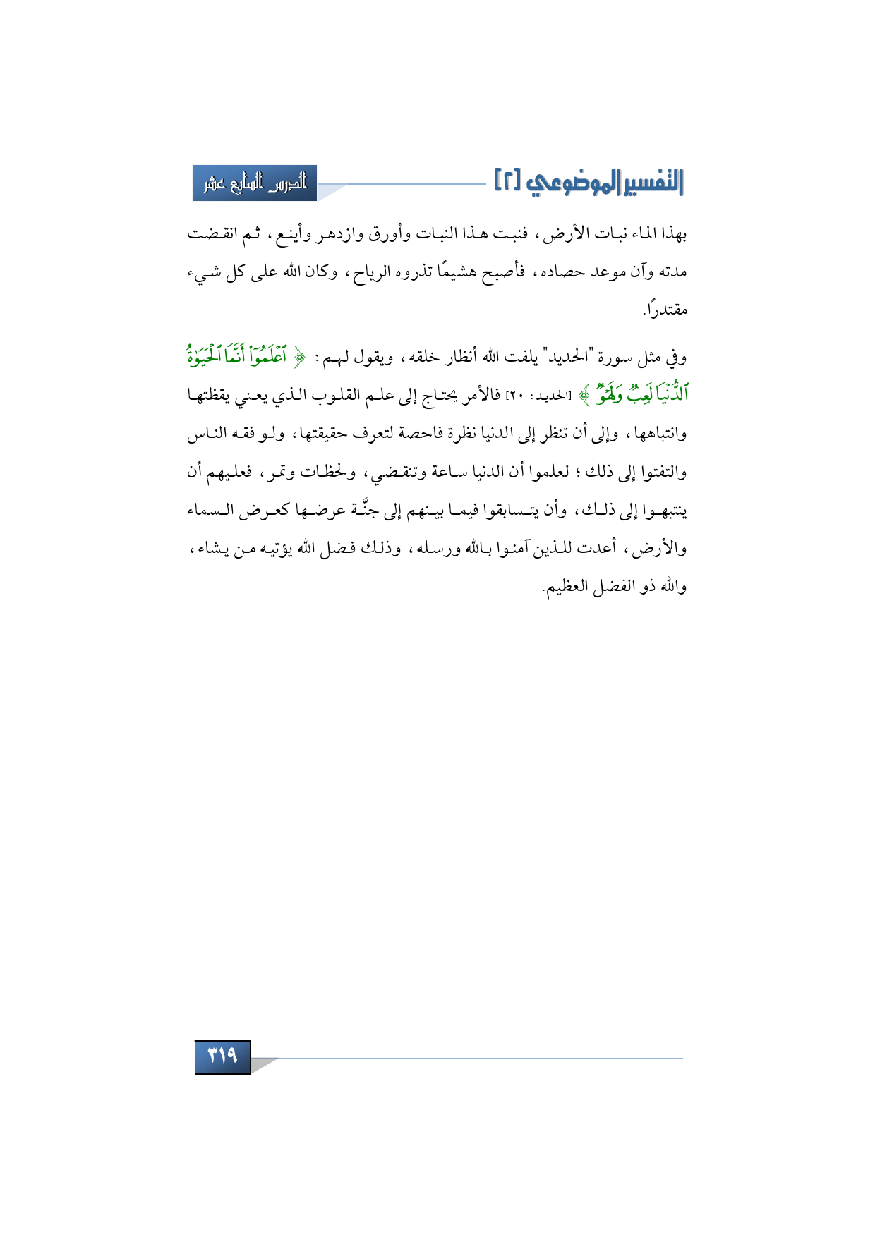 بهذا الماء نبات الأرض، فنبت هذا النبات وأورق وازدهر وأينع، ثم انقضت مدته، وآن موعد حصاده، فأصبح هشيمًا تذروه الرياح، وكان الله على كل شيء مقتدرًا.