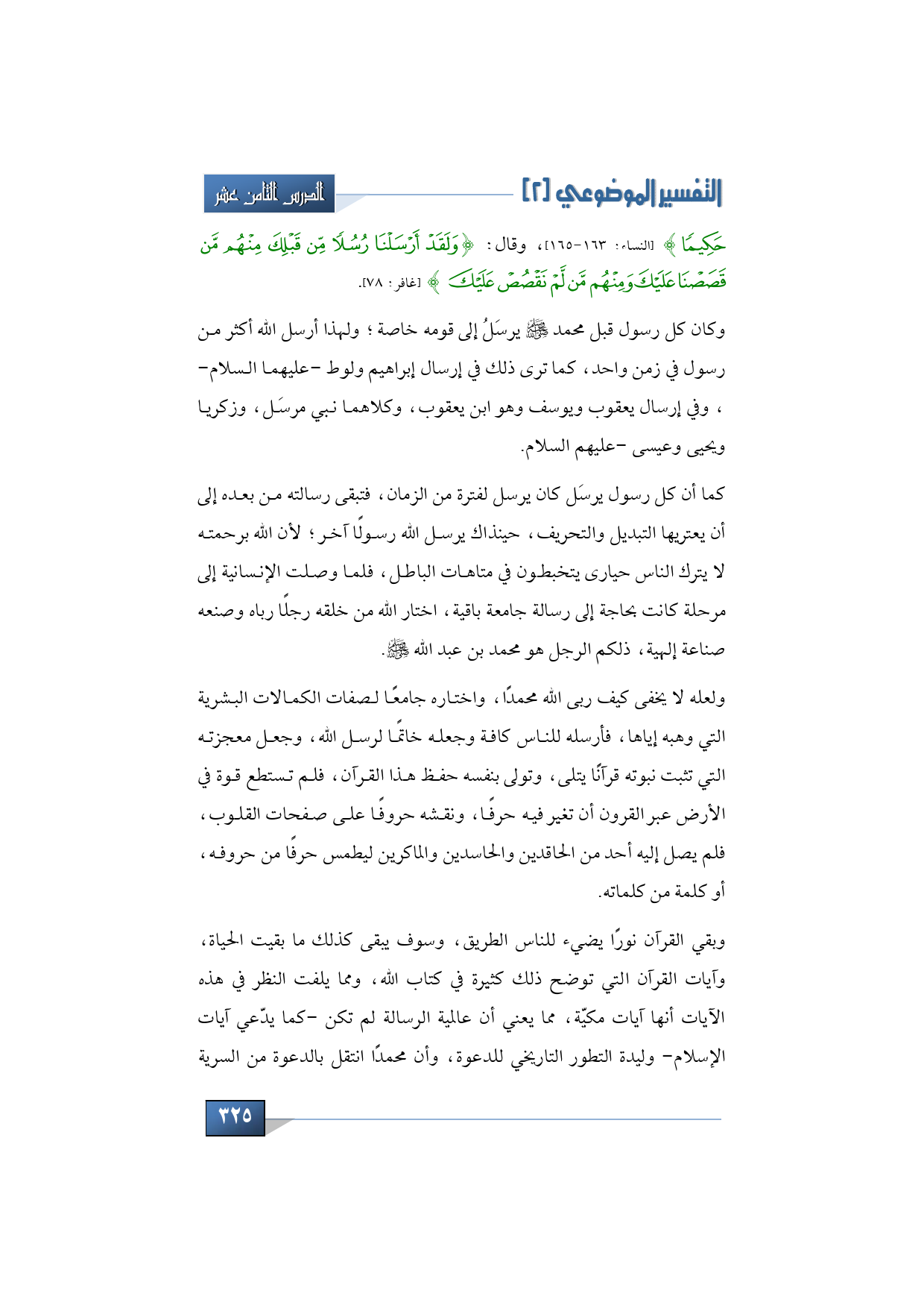 حَكِيمًا} (النساء: 163 - 165)، وقال: {وَلَقَدْ أَرْسَلْنَا رُسُلًا مِنْ قَبْلِكَ مِنْهُمْ مَنْ قَصَصْنَا عَلَيْكَ وَمِنْهُمْ مَنْ لَمْ نَقْصُصْ عَلَيْكَ} (غافر: 78).