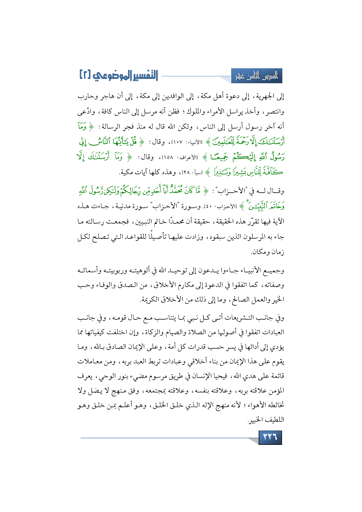 وقال له في "الأحزاب": {مَا كَانَ مُحَمَّدٌ أَبَا أَحَدٍ مِنْ رِجَالِكُمْ وَلَكِنْ رَسُولَ اللَّهِ وَخَاتَمَ النَّبِيِّينَ} (الأحزاب: 40). وسورة "الأحزاب" سورة مدنية، جاءت هذه الآية فيها تقرّر هذه الحقيقة، حقيقة أن محمدًا خاتم النبيين، فجمعت رسالته ما جاء به المرسلون الذين سبقوه، وزادت عليها تأصيلًا للقواعد التي تصلِح كل زمان ومكان.