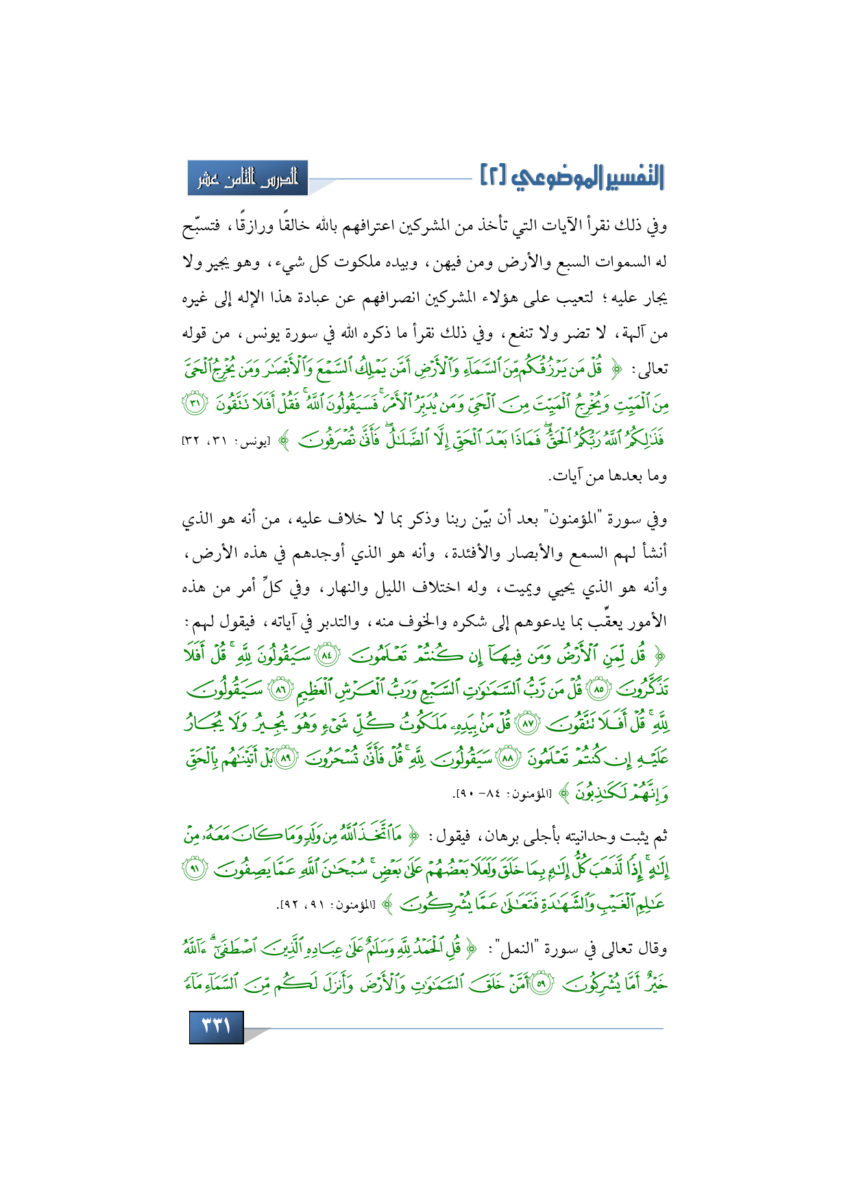 وفي ذلك تقرأ الآيات التي تأخذ من المشركين اعترافهم بالله خالقًا ورازقًا، تسبّح له السموات السبع والأرض ومن فيهن، وبيده ملكوت كل شيء وهو يجير ولا يجار عليه، لتعيب على هؤلاء المشركين انصرافهم عن عبادة هذا الإله إلى غيره من آلهة لا تضر ولا تنفع، اقرءوا في ذلك ما ذكره الله في سورة يونس، من قول الله تعالى: {قُلْ مَنْ يَرْزُقُكُمْ مِنَ السَّمَاءِ وَالْأَرْضِ أَمْ مَنْ يَمْلِكُ السَّمْعَ وَالْأَبْصَارَ وَمَنْ يُخْرِجُ الْحَيَّ مِنَ الْمَيِّتِ وَيُخْرِجُ الْمَيِّتَ مِنَ الْحَيِّ وَمَنْ يُدَبِّرُ الْأَمْرَ فَسَيَقُولُونَ اللَّهُ فَقُلْ أَفَلَا تَتَّقُونَ * فَذَلِكُمُ اللَّهُ رَبُّكُمُ الْحَقُّ فَمَاذَا بَعْدَ الْحَقِّ إِلَّا الضَّلَالُ فَأَنَّى تُصْرَفُونَ} (يونس: 31، 32) وما بعدها من آيات.