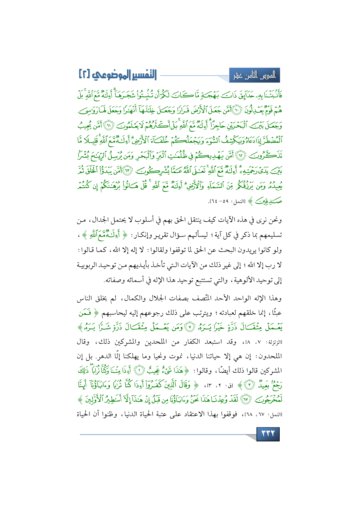 فَأَنْبَتْنَا بِهِ حَدَائِقَ ذَاتَ بَهْجَةٍ مَا كَانَ لَكُمْ أَنْ تُنْبِتُوا شَجَرَهَا أَإِلَهٌ مَعَ اللَّهِ بَلْ هُمْ قَوْمٌ يَعْدِلُونَ * أَمْ مَنْ جَعَلَ الْأَرْضَ قَرَارًا وَجَعَلَ خِلَالَهَا أَنْهَارًا وَجَعَلَ لَهَا رَوَاسِيَ وَجَعَلَ بَيْنَ الْبَحْرَيْنِ حَاجِزًا أَإِلَهٌ مَعَ اللَّهِ بَلْ أَكْثَرُهُمْ لَا يَعْلَمُونَ * أَمْ مَنْ يُجِيبُ الْمُضْطَرَّ إِذَا دَعَاهُ وَيَكْشِفُ السُّوءَ وَيَجْعَلُكُمْ خُلَفَاءَ الْأَرْضِ أَإِلَهٌ مَعَ اللَّهِ قَلِيلًا مَا تَذَكَّرُونَ * أَمْ مَنْ يَهْدِيكُمْ فِي ظُلُمَاتِ الْبَرِّ وَالْبَحْرِ وَمَنْ يُرْسِلُ الرِّيَاحَ بُشْرًا بَيْنَ يَدَيْ رَحْمَتِهِ أَإِلَهٌ مَعَ اللَّهِ تَعَالَى اللَّهُ عَمَّا يُشْرِكُونَ * أَمْ مَنْ يَبْدَأُ الْخَلْقَ ثُمَّ يُعِيدُهُ وَمَنْ يَرْزُقُكُمْ مِنَ السَّمَاءِ وَالْأَرْضِ أَإِلَهٌ مَعَ اللَّهِ قُلْ هَاتُوا بُرْهَانَكُمْ إِنْ كُنْتُمْ صَادِقِينَ} (النمل: 59 - 64).
