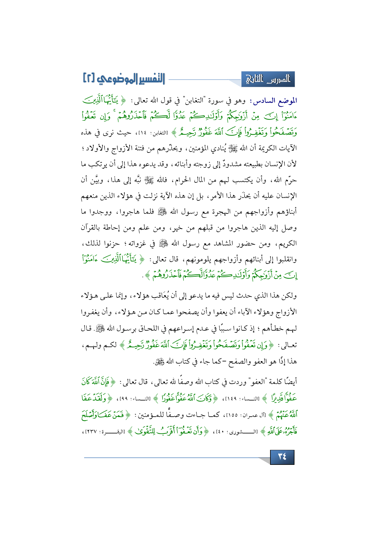 الموضع السادس: وهو في سورة "التغابن" في قول الله تعالى: {يَا أَيُّهَا الَّذِينَ آمَنُوا إِنَّ مِنْ أَزْوَاجِكُمْ وَأَوْلَادِكُمْ عَدُوًّا لَكُمْ فَاحْذَرُوهُمْ وَإِنْ تَعْفُوا وَتَصْفَحُوا وَتَغْفِرُوا فَإِنَّ اللَّهَ غَفُورٌ رَحِيمٌ} (التغابن: 14) فماذا نرى في هذه الآيات الكريمة نرى أن الله -سبحانه وتعالى- يُنادي المؤمنين، يحذّرهم من فتنة الأزواج والأولاد؛ لأن الإنسان بطبيعته مشدودٌ إلى زوجته وأبنائه، وقد يَدْعُه هذا إلى أن يرتكب ما حرم الله، وأن يكتسب لهم من المال الحرام، فالله -سبحانه وتعالى- نبَّه إلى هذا، وبيَّن أن الإنسان عليه أن يحذر هذا الأمر، بل إن هذه الآية نزلت في هؤلاء الذين منعهم أبناؤهم وأزواجهم من الهجرة مع رسول الله -صلى الله عليه وسلم- فلما هاجروا ووجدوا ما وصل إليه الذين هاجروا من قبلهم من خير ومن علم ومن إحاطة بالقرآن الكريم، ومن حضور المشاهد مع رسول الله -صلى الله عليه وسلم- في غزواته حزنوا لذلك، وانقلبوا إلى أبنائهم وأزواجهم يلومونهم فقال تعالى: {يَا أَيُّهَا الَّذِينَ آمَنُوا إِنَّ مِنْ أَزْوَاجِكُمْ وَأَوْلَادِكُمْ عَدُوًّا لَكُمْ فَاحْذَرُوهُمْ}.