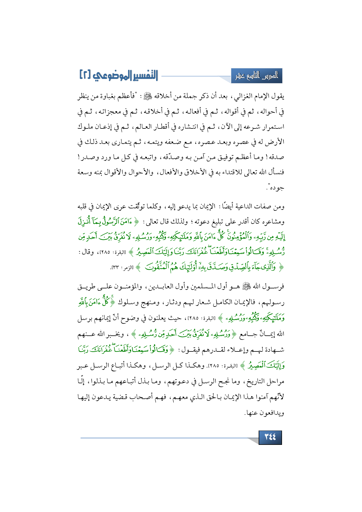 فرسول الله -صلى الله عليه وسلم- هو أول المسلمين وأول العابدين، والمؤمنون على طريق رسولهم، الإيمان الكامل والفاعل شعار لهم ودثار، ومنهج وسلوك {كُلٌّ آمَنَ بِاللَّهِ وَمَلَائِكَتِهِ وَكُتُبِهِ وَرُسُلِهِ} (البقرة: 285) يعلنون في وضوح أنّ إيمانهم برسل الله إيمانٌ جامع {لَا نُفَرِّقُ بَيْنَ أَحَدٍ مِنْ رُسُلِهِ}، ويخبر الله عنهم شهادة لهم، وإعلاء لقدرهم فيقول: {وَقَالُوا سَمِعْنَا وَأَطَعْنَا غُفْرَانَكَ رَبَّنَا وَإِلَيْكَ الْمَصِيرُ} (البقرة: 285)، وهكذا كل الرسل، وهكذا أتباع الرسل عبر مراحل التاريخ، وما نجح الرسل في دعوتهم، وما بذل أتباعهم ما بذلوا، إلّا لأنّهم آمنوا هذا الإيمان بالحق الذي معهم، فهم أصحاب قضية يدعون إليها ويدافعون عنها.