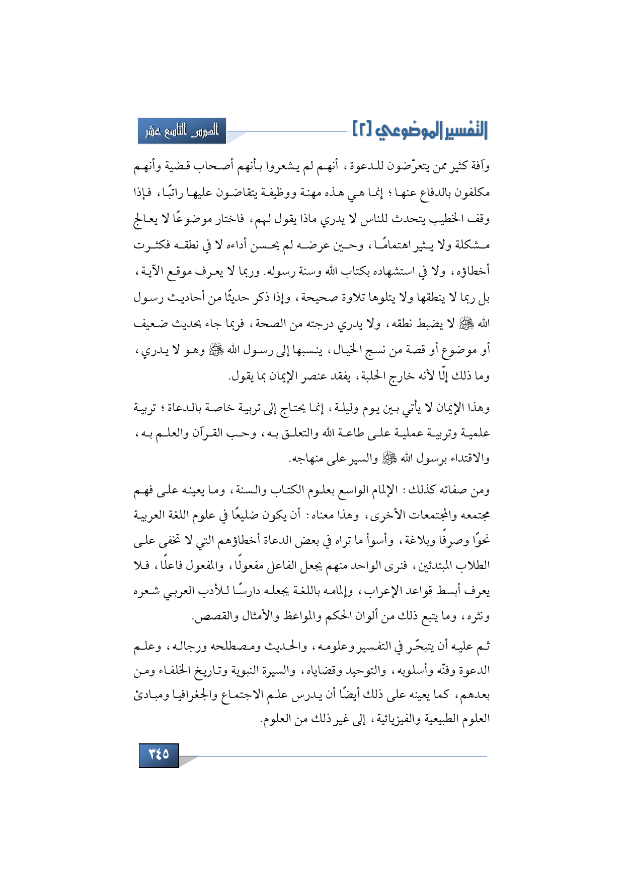 ثم عليه أن يتبحر في التفسير وعلومه، والحديث ومصطلحه ورجاله، وعلم الدعوة وفنّه وأسلوبه، والتوحيد وقضاياه، والسيرة النبوية وتاريخ الخلفاء ومن بعدهم، كما يعينه على ذلك أيضًا أن يدرس علم الاجتماع والجغرافيا ومبادئ العلوم الطبية والفيزيائية، إلى غير ذلك من العلوم.