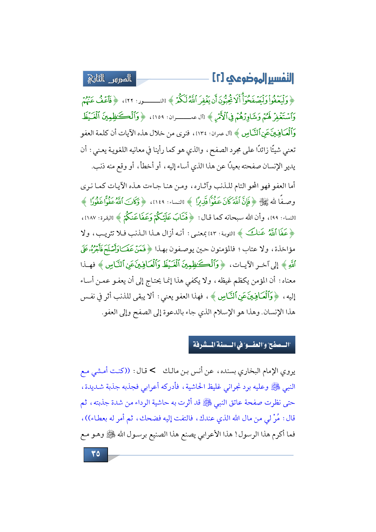 أما العفو فهو المحو التام للذنب وآثاره، ومن هنا جاءت هذه الآيات كما نرى وصفًا لله -سبحانه وتعالى-، {فَإِنَّ اللَّهَ كَانَ عَفُوًّا قَدِيرًا}، {إِنَّ اللَّهُ عَفُوًّا غَفُورًا}، وأن الله سبحانه كما قال: {فَتَابَ عَلَيْكُمْ وَعَفَا عَنْكُمْ}، {عَفَا اللهُ عَنْكَ} بمعنى: أنه أزال هذا الذنب فلا تثريب، ولا مؤاخذة، ولا عتاب؛ فالمؤمنون حين يصفون بهذا {فَمَنْ عَفَا وَأَصْلَحَ فَأَجْرُهُ عَلَى اللَّهِ} إلى آخر الآيات، {وَالْكَاظِمِينَ الْغَيْظَ وَالْعَافِينَ عَنِ النَّاسِ} فهذا معناه: أن المؤمن يكظم غيظه، ولا يكفي هذا إنما يحتاج إلى أن يعفو عمن أساء إليه، {وَالْعَافِينَ عَنِ النَّاسِ}، فهذا العفو يعني: ألا يبقى للذنب أثر في نفس هذا الإنسان. وهذا هو الإسلام الذي جاء بالدعوة إلى الصفح وإلى العفو.