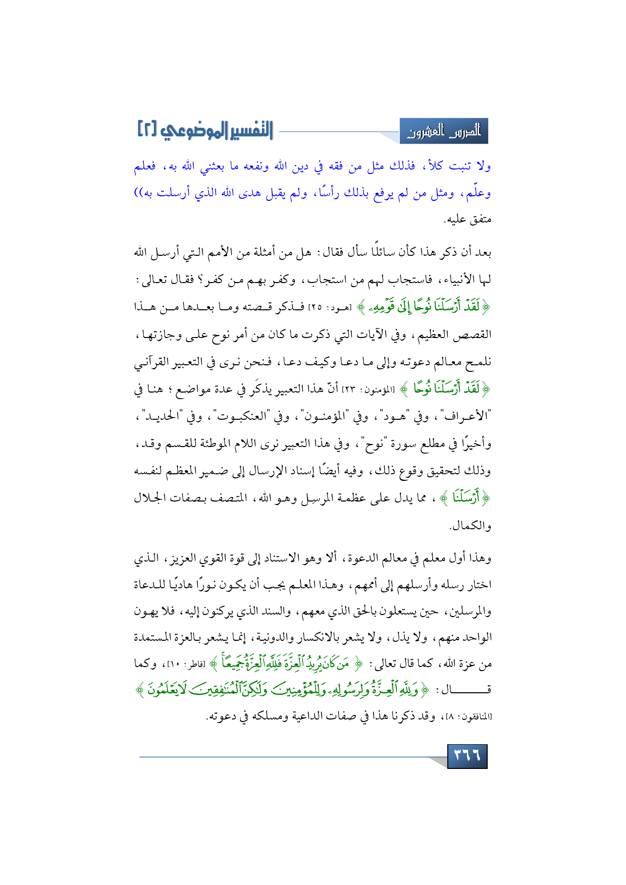 وهذا أول معلم في معالم الدعوة، ألا وهي الاستناد إلى قوة القوي العزيز، الذي اختار رسله وأرسلهم إلى أممهم، وهذا المعلم يجب أن يكون نورًا هاديًا للدعاة والمرسلين، حين يستعلون بالحق الذي معهم، والسند الذي يركنون إليه، فلا يهون الواحد منهم، ولا يذل، ولا يشعر بالانكسار والدونية، إنما يشعر بالعزة المستمدة من عزة الله، كما قال تعالى: {مَنْ كَانَ يُرِيدُ الْعِزَّةَ فَلِلَّهِ الْعِزَّةُ جَمِيعًا} (فاطر: 10) وكما قال: {وَلِلَّهِ الْعِزَّةُ وَلِرَسُولِهِ وَلِلْمُؤْمِنِينَ وَلَكِنَّ الْمُنَافِقِينَ لَا يَعْلَمُونَ} (المنافقون: 8) وقد ذكرت هذا كما تعلمون في صفات الداعية ومسلكه في دعوته.