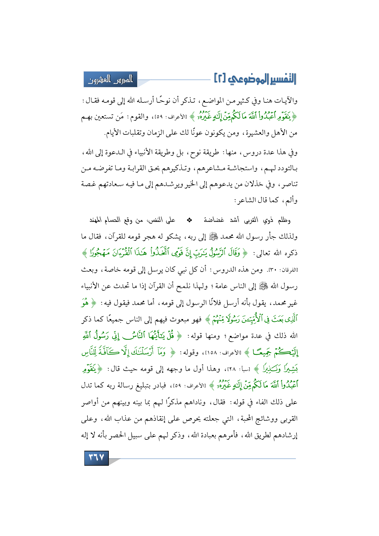 ومن هذه الدروس: أن كل نبي كان يرسل إلى قومه خاصة، وبعث رسول الله -صلى الله عليه وسلم- إلى الناس عامة، ولهذا تلمح أن القرآن إذا ما تحدث عن الأنبياء غير محمد يقول: بأنه أرسل فلانًا الرسول إلى قومه، أما محمد فيقول فيه: {هُوَ الَّذِي بَعَثَ فِي الأُمِّيِّينَ رَسُولًا مِنْهُمْ} فهو مبعوث فيهم إلى الناس جميعًا كما ذكر الله ذلك في عدة مواضع؛ ومنها قوله: {قُلْ يَا أَيُّهَا النَّاسُ إِنِّي رَسُولُ اللَّهِ إِلَيْكُمْ جَمِيعًا} (الأعراف: 158) وقوله: {وَمَا أَرْسَلْنَاكَ إِلَّا كَافَّةً لِلنَّاسِ بَشِيرًا وَنَذِيرًا} (سبأ: 28) وهذه أول ما وجهه إلى قومه فقال: {يَا قَوْم اعْبُدُوا اللَّهَ مَا لَكُمْ مِنْ إِلَهٍ غَيْرُهُ} (الأعراف: 59) فترى أنه بادر بتبليغ رسالة ربه كما تدل على ذلك الفاء في قوله: "فقال"، وناداهم مذكرًا لهم بما بينه وبينهم من أواصر القربى ووشائج المحبة التي جعلته يحرص على إنقاذهم من عذاب الله، وعلى إرشادهم لطريق الله، فأمرهم بعبادة الله، وذكر لهم على سبيل الحصر بأنهم لا إله