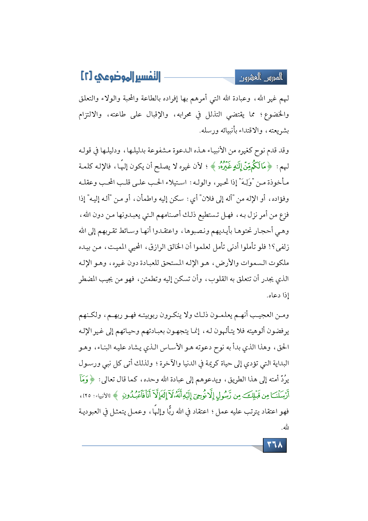 ومن العجيب أنهم يعلمون ذلك ولا ينكرون ربوبيته، فهو ربهم، ولكنهم يرفضون ألوهيته فلا يتألهون له، إنما يتجهون بعبادتهم وحياتهم إلى غير الإله الحق، وهذا الذي بدأ به نوح دعوته هو الأساس الذي يشاد عليه البناء، وهو البداية التي تؤدي إلى حياة كريمة في الدنيا والآخرة، ولذلك أتى كل نبي ورسول يرُدّ أمته إلى هذا الطريق، ويدعوهم إلى عبادة الله وحده، كما قال تعالى: {وَمَا أَرْسَلْنَا مِنْ قَبْلِكَ مِنْ رَسُولٍ إِلَّا نُوحِي إِلَيْهِ أَنَّهُ لَا إِلَهَ إِلَّا أَنَا فَاعْبُدُونِ} (الأنبياء: 25) فهو اعتقاد يترتب عليه عمل، اعتقاد في الله ربًّا وإلهًا، وعمل يتمثل في العبودية لله.